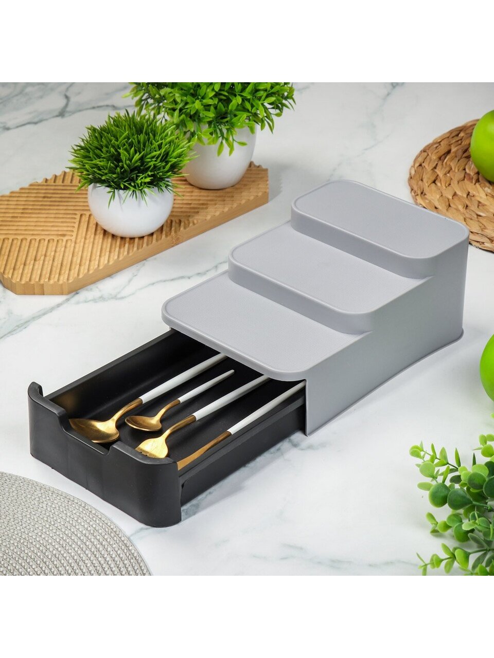 Кухонный органайзер — это функциональный и практичный аксессуар, который помогает оптимизировать пространство в вашем доме. Он сделан из прочного пластика, обеспечивающего удобство использования и защиту содержимого от повреждений. Органайзер имеет отсек, благодаря чему можно разместить разные предметы. Таким образом, вы всегда будете знать, где что лежит, и легко найдёте нужную вещь.