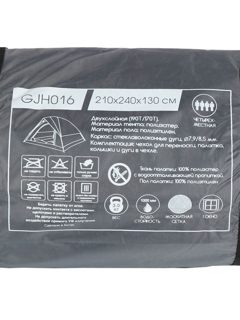 Рекомендуется ручная стирка и сушка без отжима в подвешенном состоянии. Запрещается: гладить, отбеливать, подвергать химчистке, сушить в стиральной машине. Берегите палатку от огня. Не допускайте контакта с кислотами, щелочами и растворителями.