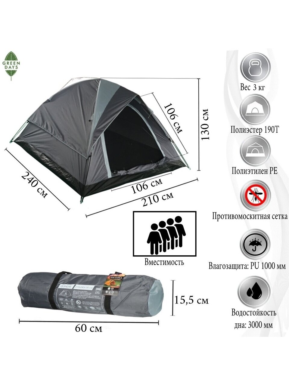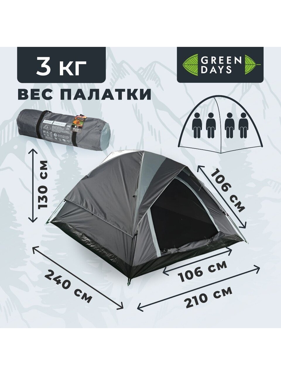 Вы можете приобрести «Палатка 4-местная, 240х210х130 см, 2 слоя, 1 комн, с москитной сеткой, 1 вентиляционное окно, Green Days, GJH016» и другие товары в нашем интернет-магазине в Краснодаре по низким ценам и с бесплатным самовывозом.