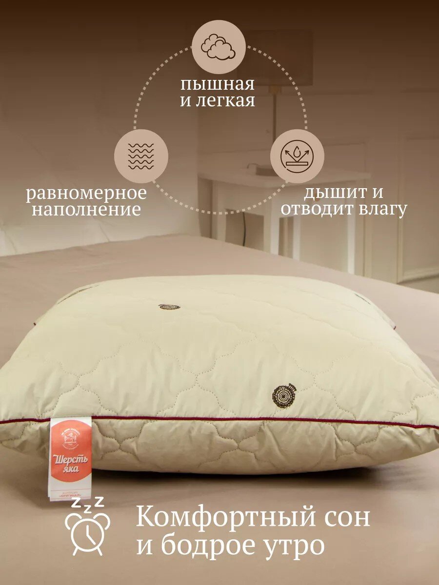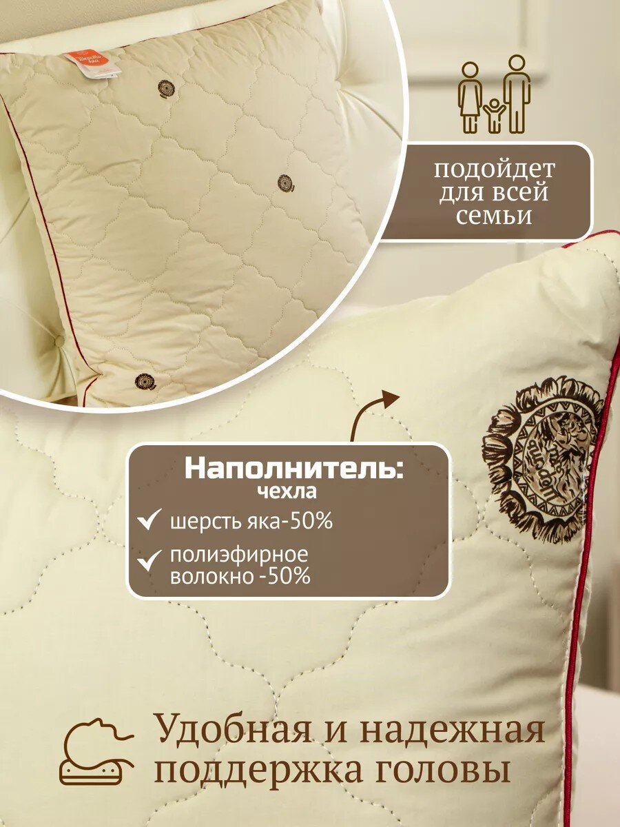 Уютные подушки с наполнителем из шерсти яка помогают расслабиться и отдохнуть, погружают в здоровый освежающий сон. Наполнитель скомбинирован из высокоизвитого силиконизированного волокна, микроволокна «Лебяжий пух» и термоскреплённой натуральной шерсти яка (плотность 150 г/м2). Мягкий упругий наполнитель долго сохраняет форму подушки, хорошо пропускает воздух и влагу. Поэтому подушки не преют, не накапливают запахи и быстро сохнут.