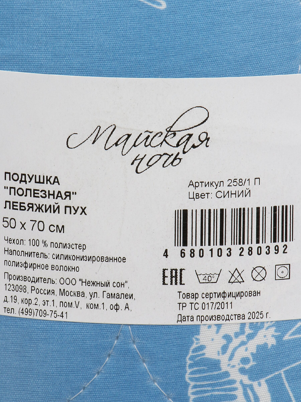 Подушка 50х70 см «Полезная» с лебяжьим пухом от бренда «Майская ночь» — комфортный сон без аллергии, оптимальная поддержка и долговечность для дома и дачи.