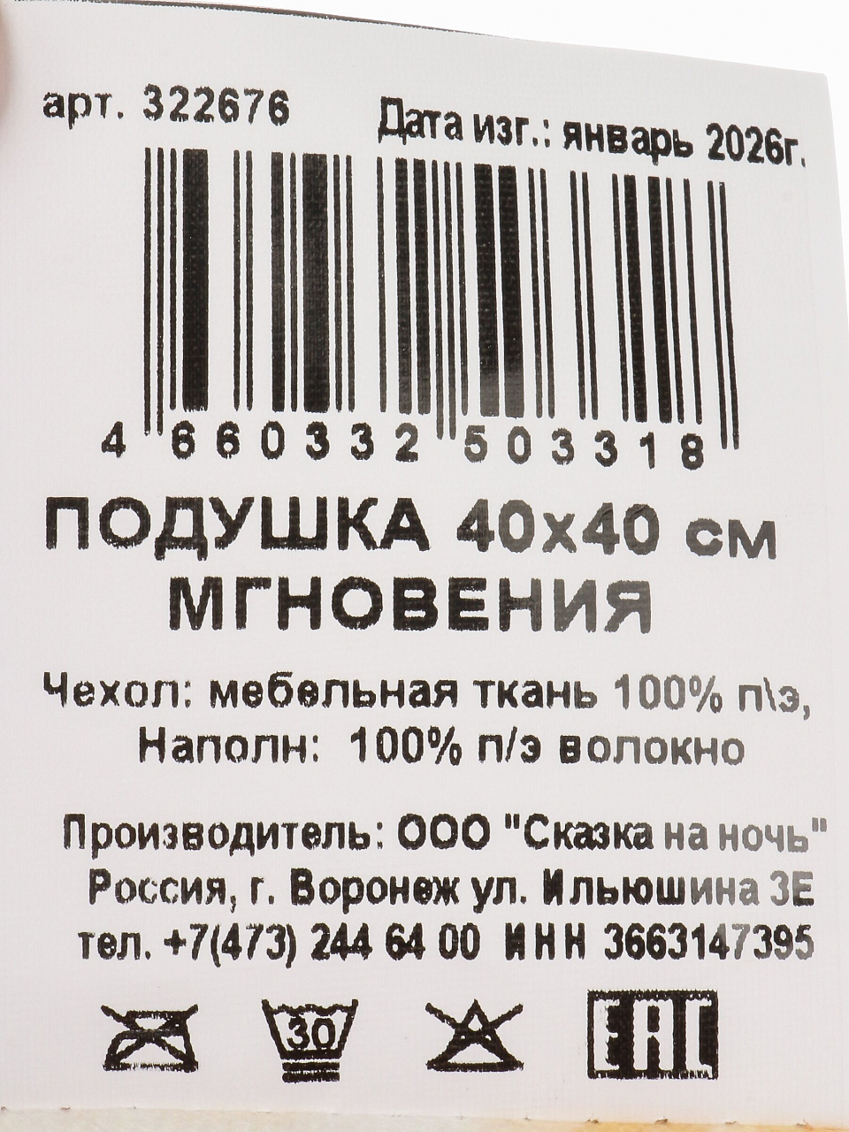 - Размер 40х40 см, гипоаллергенный наполнитель, 100% полиэстер — легко стирается, не теряет форму