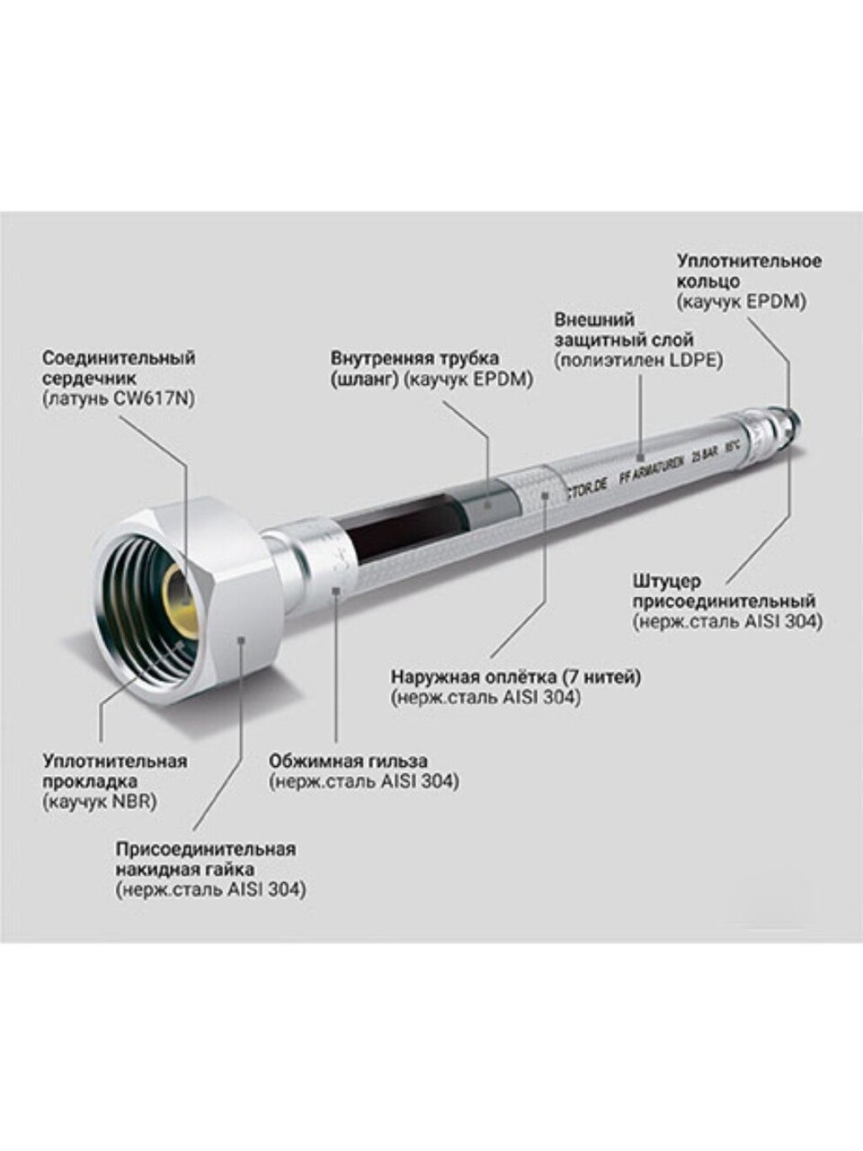 - материал оплетки — нержавеющая сталь с полимерным покрытием для максимальной защиты от коррозии и повреждений;