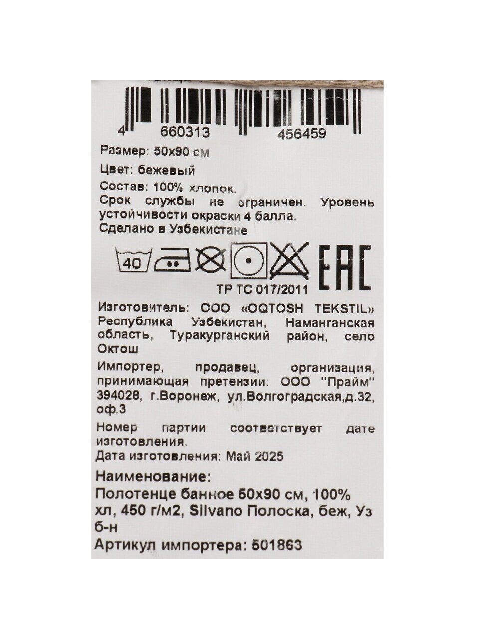 Вы можете приобрести «Полотенце банное 50х90 см, 100% хлопок, 450 г/м2, Полоска, Silvano, бежевое, Узбекистан» и другие товары в нашем интернет-магазине в Таганроге по низким ценам и с бесплатным самовывозом.