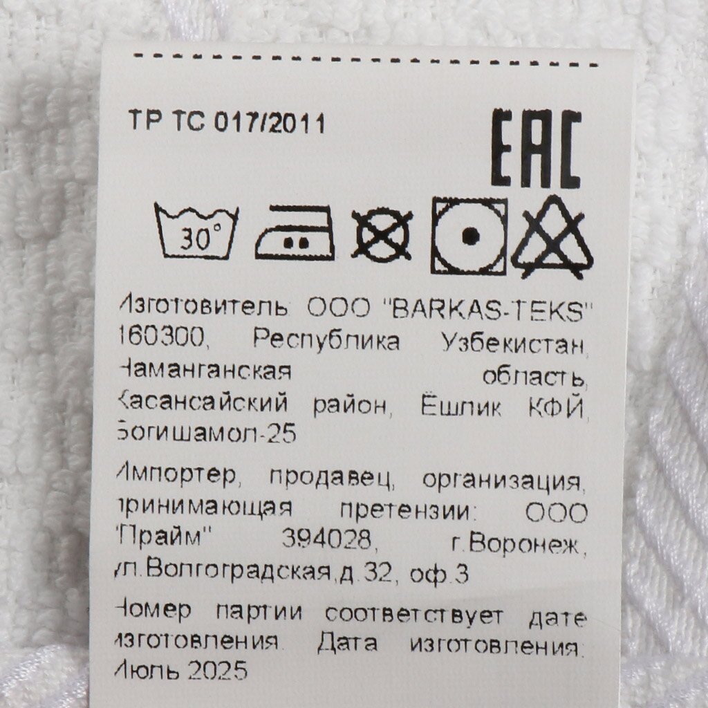 Полотенце выполнено из 100% хлопка плотностью 400 г/м2, произведено в Узбекистане. Белый цвет, махровая текстура, прочные швы.