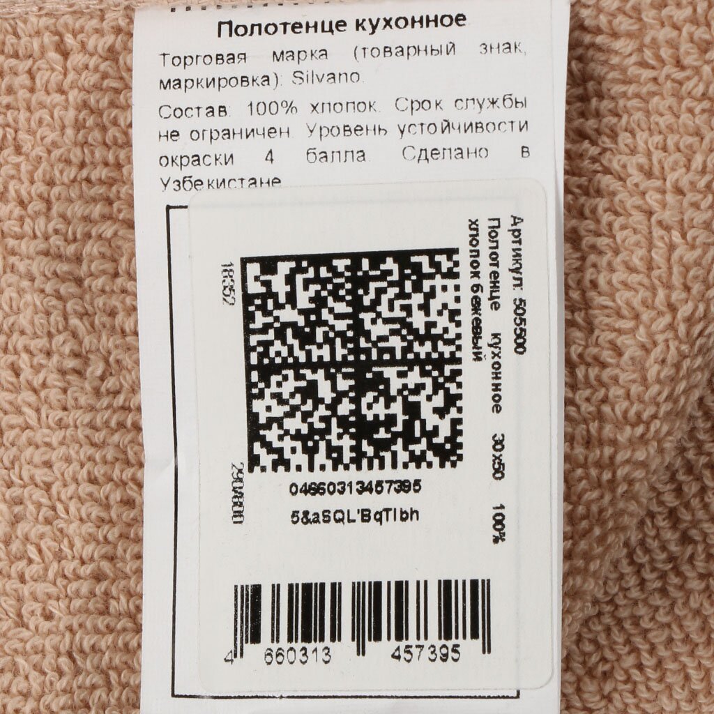 Полотенце кухонное Silvano 30x50 см: плотная махра 480 г/м2, 100% хлопок, бежевый — комфорт и стиль для вашей кухни.