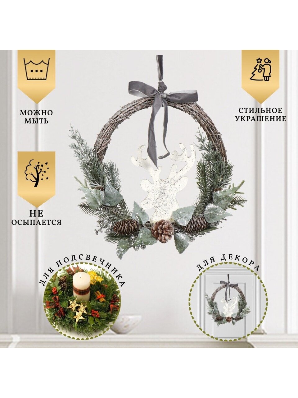 Живописная рождественская композиция принесет долгожданный дух зимних праздников, сделает атмосферу в доме уютной, торжественной и элегантной. Этот венок со временем не осыпается и не создает никакого мусора при использовании, поэтому прослужит вам не один год и станет постоянным атрибутом декора вашего дома или рабочего пространства.