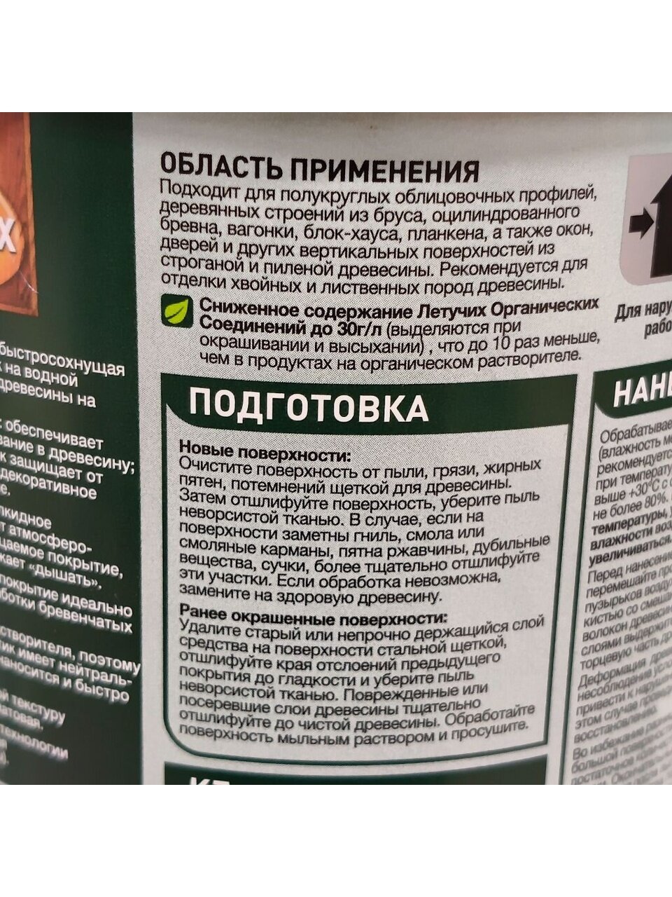 - Органический растворитель (уайт-спирит) заменен водой, что делает лазурь менее пахучей, снижает содержание ЛОС (летучие органические соединения) и облегчает нанесение.