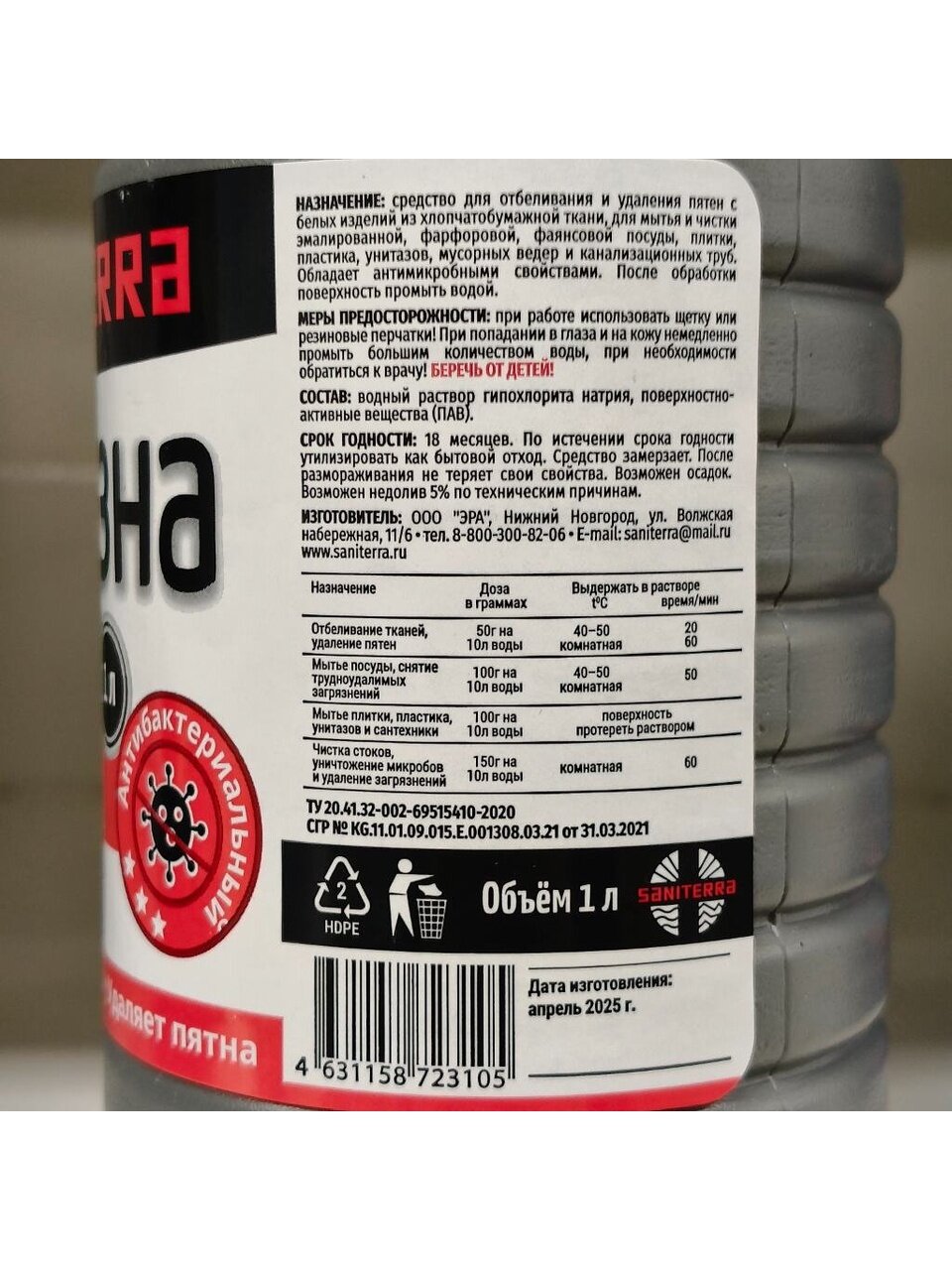 SANITERRA Белизна гель - это гель-концентрат для отбеливания, дезодорирования и удаления пятен с белых изделий из х/б и льняных тканей, а также для мытья и дезинфекции эмалированной, фарфоровой, фаянсовой посуды, облицовочной плитки, полов, пластика, унитазов, сантехники, мусорных ведер.