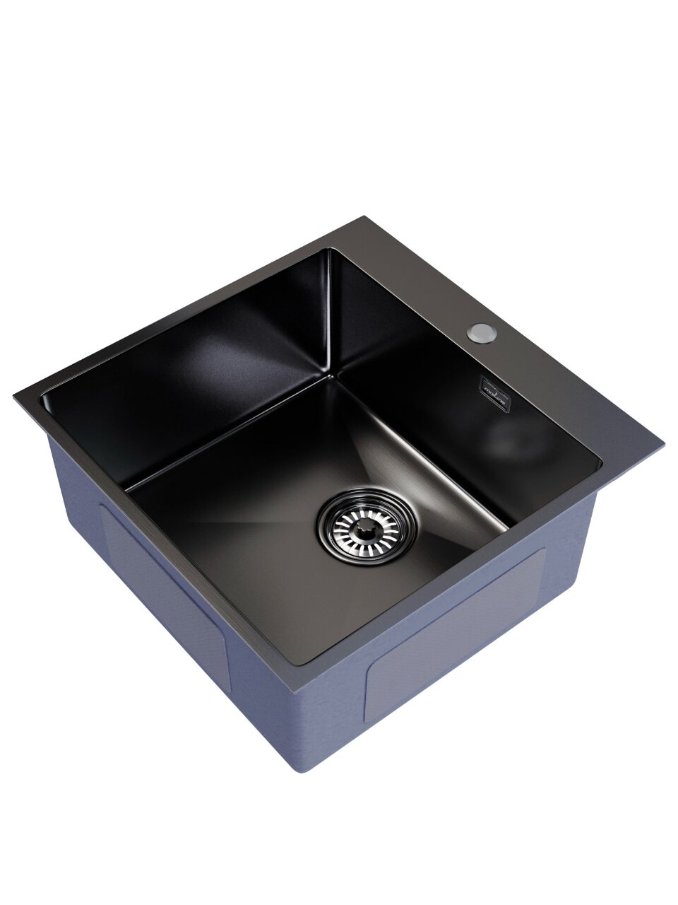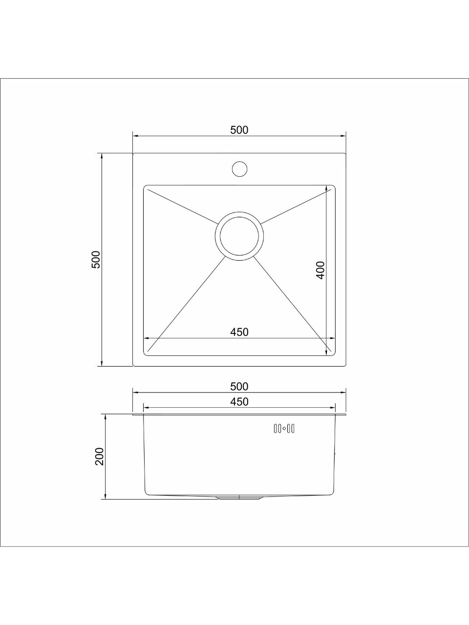 Размер мойки — 500х500 мм, глубина чаши — 200 мм. Это универсальный формат, который подходит для большинства стандартных кухонных шкафов и столешниц.