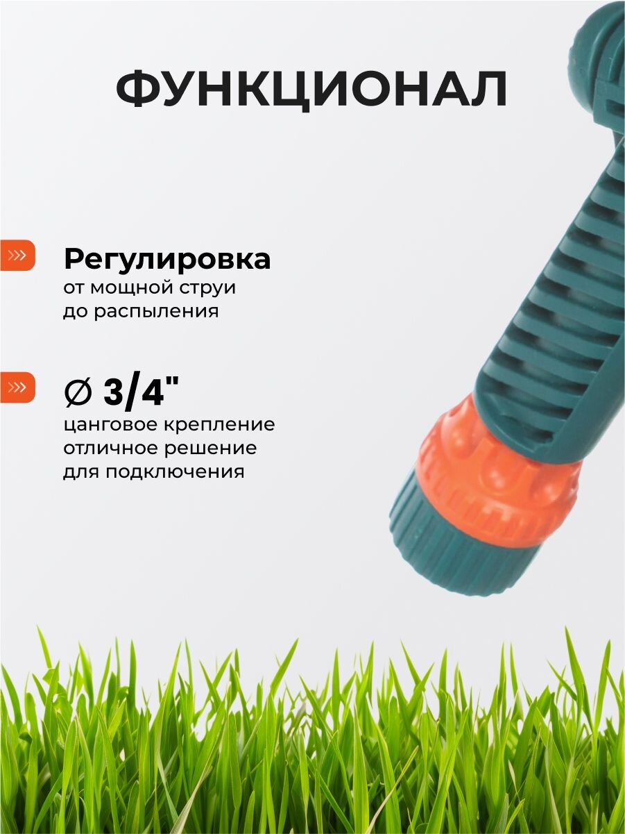Душ-пистолет 3/4" с цанговым креплением — надежное решение для полива газона, огорода и организации душа на даче. Прочный пластиковый корпус и статическая конструкция разбрызгивателя обеспечивают равномерное распределение воды. Простое подключение диаметром 3/4" делает установку быстрой и удобной.