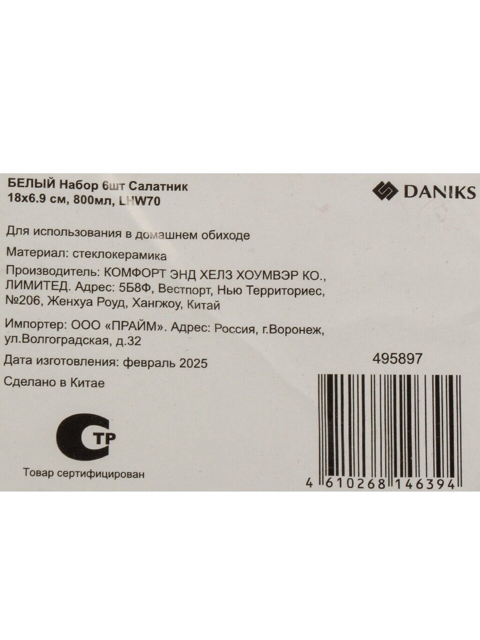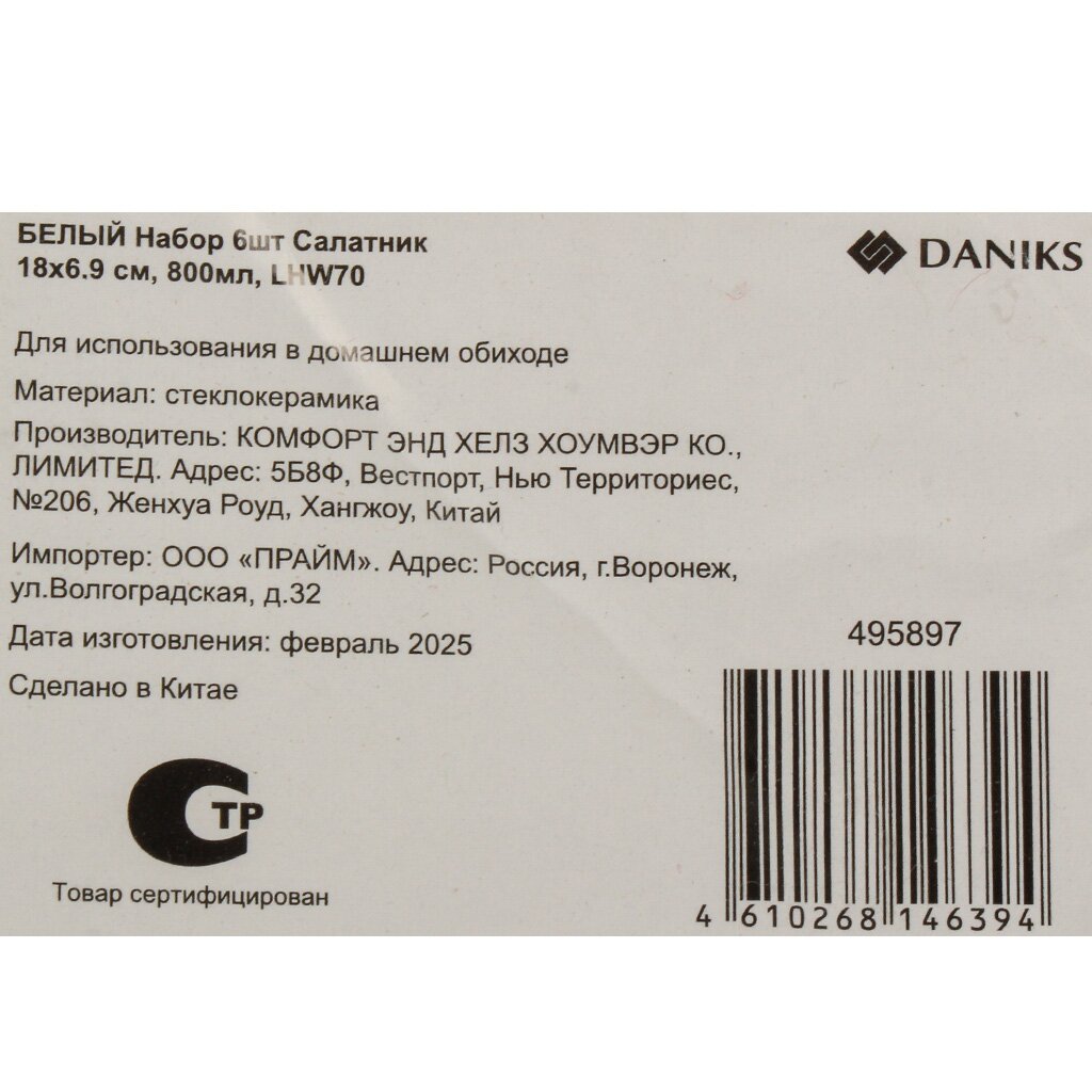 Салатники Daniks из стеклокерамики: 6 прочных мисок 0,8 л, идеальны для сервировки, подходят для СВЧ и посудомойки. Стиль и удобство каждый день.