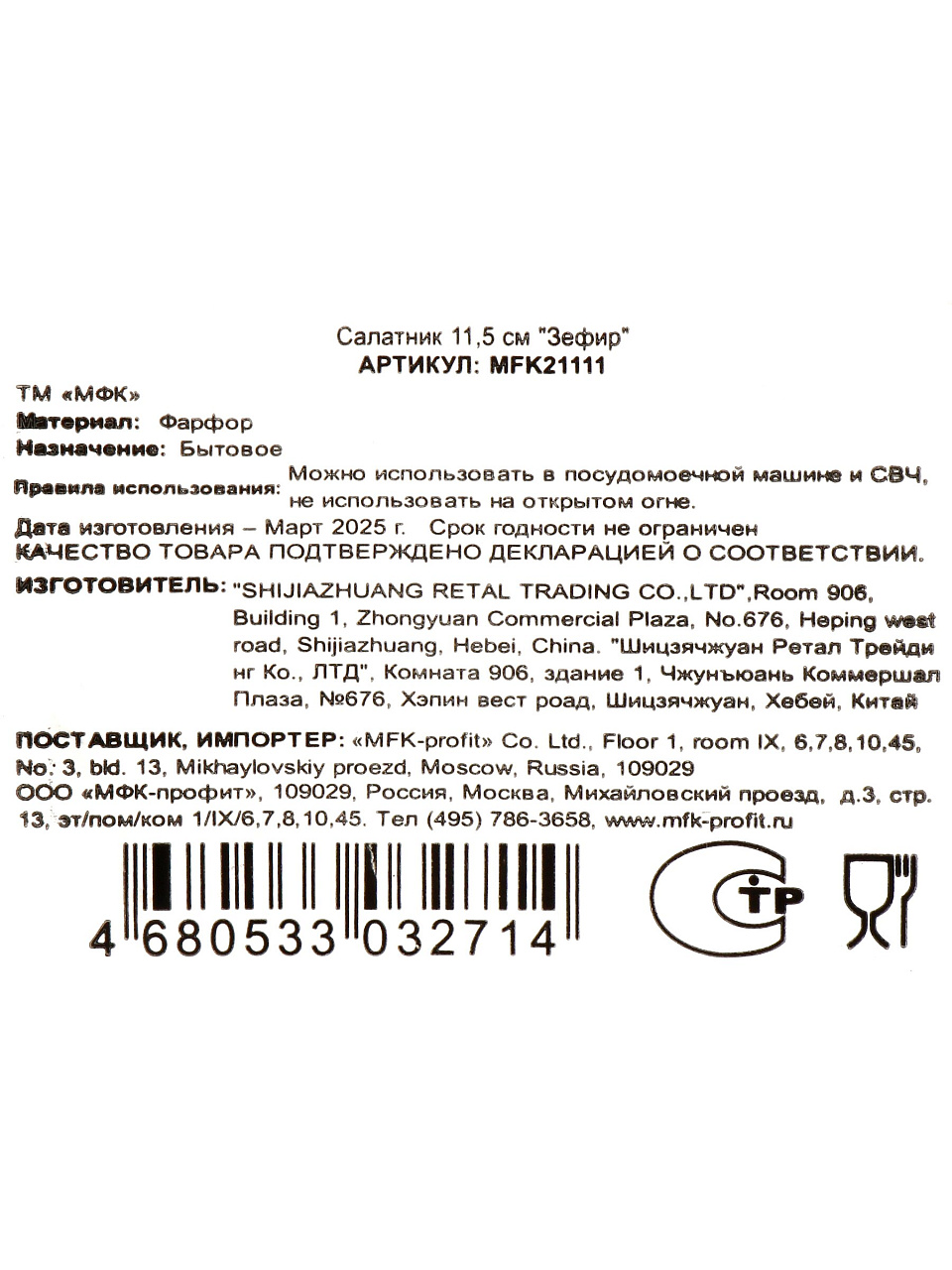 Вы можете приобрести «Салатник фарфор, круглый, 11.5х6 см, 0.3 л, Зефир, МФК, MFK21111» и другие товары в нашем интернет-магазине в Курске по низким ценам и с бесплатным самовывозом.