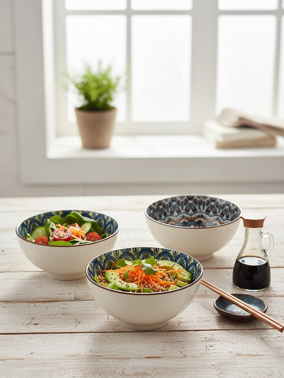 - Яркий восточный дизайн: каждый салатник с индивидуальным рисунком, создаёт атмосферу уюта и праздника.