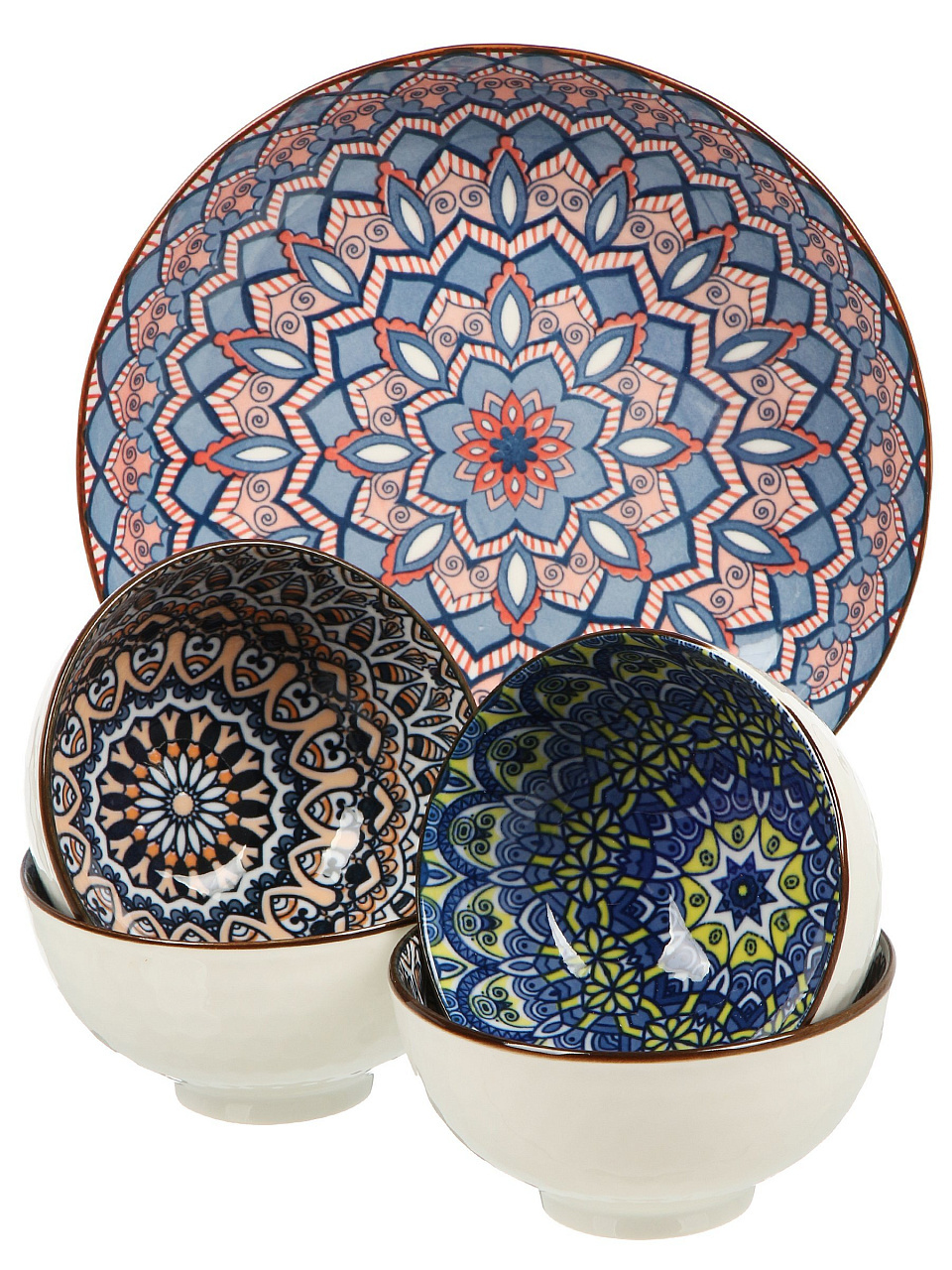 Набор салатников Восток — это практичное решение для сервировки закусок, салатов и десертов. Благодаря сочетанию четырёх небольших керамических мисок (250 мл, диаметр 11 см) и одной большой (20 см), вы сможете удобно подать блюда для семьи или гостей. Яркий разноцветный дизайн с рисунком хорошо смотрится на любом столе и подходит для современных интерьеров. Такой комплект часто ищут по запросам «какой набор салатников выбрать для подарка» или «что лучше для сервировки на даче».