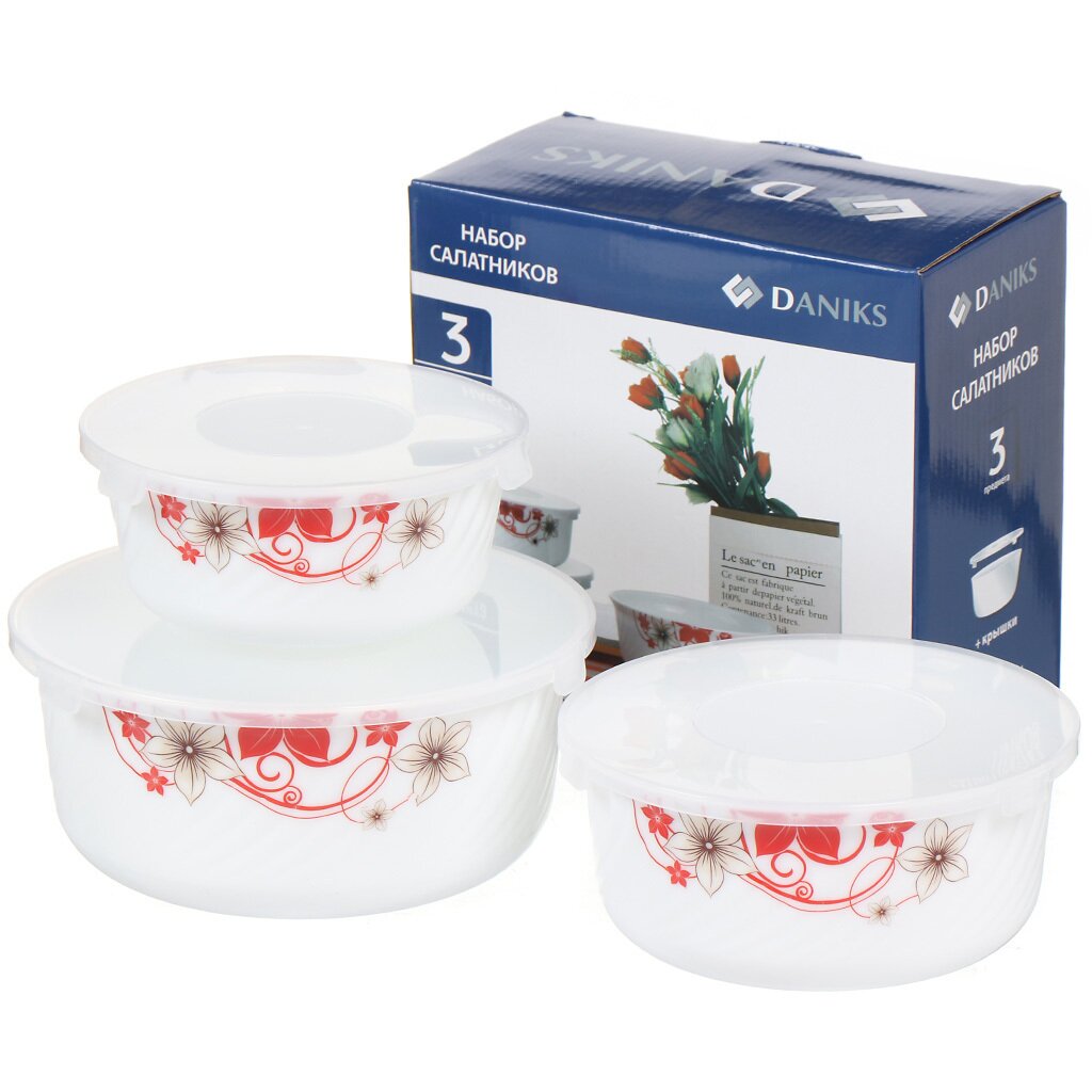 Салатники стеклокерамика Daniks Кармен 3 шт: круглая форма, 3 размера, герметичные крышки — удобно для хранения, сервировки и микроволновки.