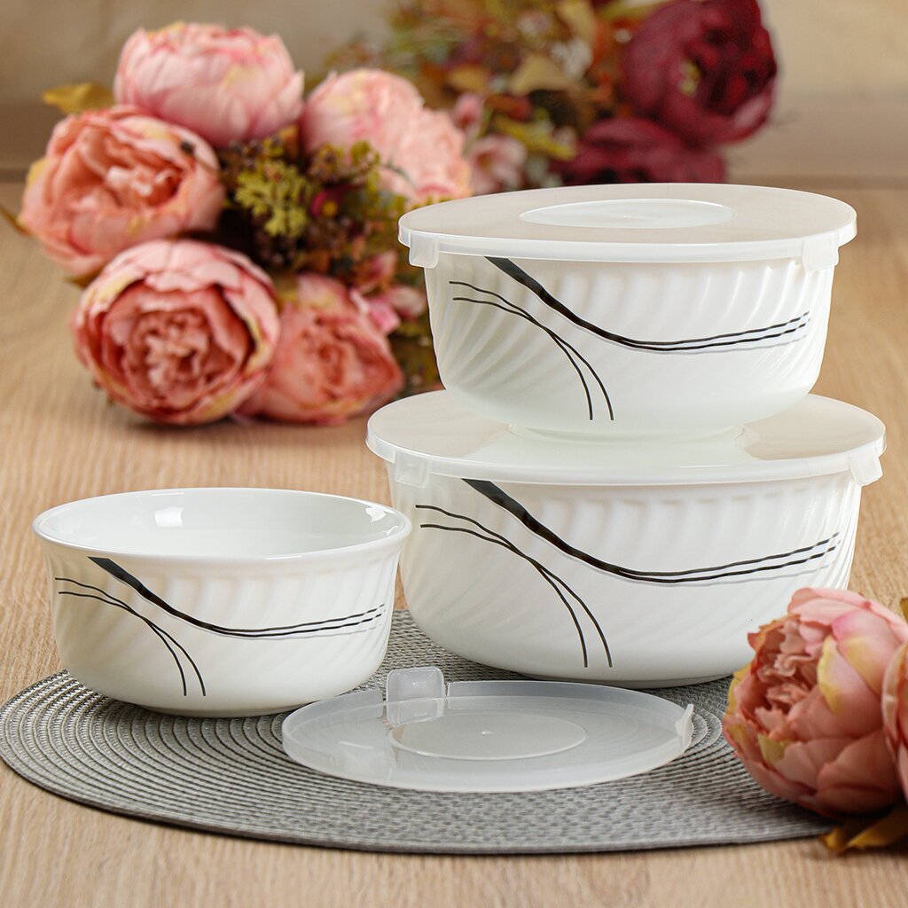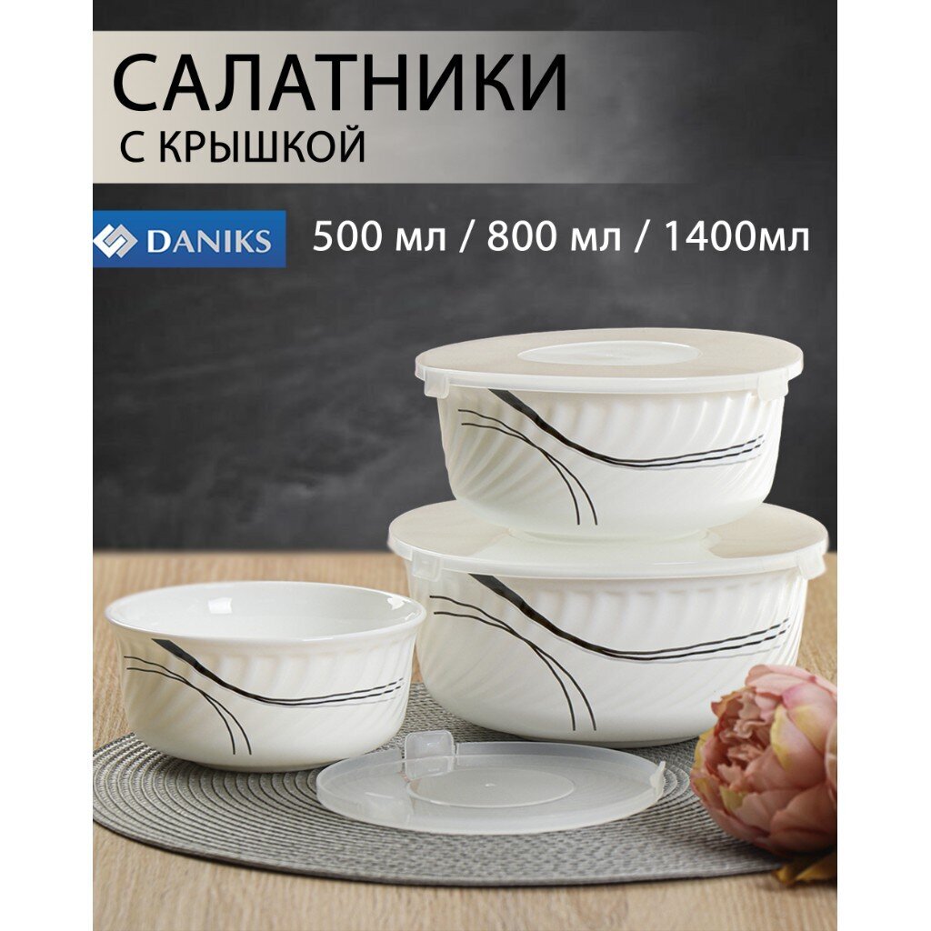 Салатники Daniks Tokyo из стеклокерамики: набор 3 размера с крышками для сервировки, хранения и подачи. Идеальный выбор для дома, дачи, подарка.