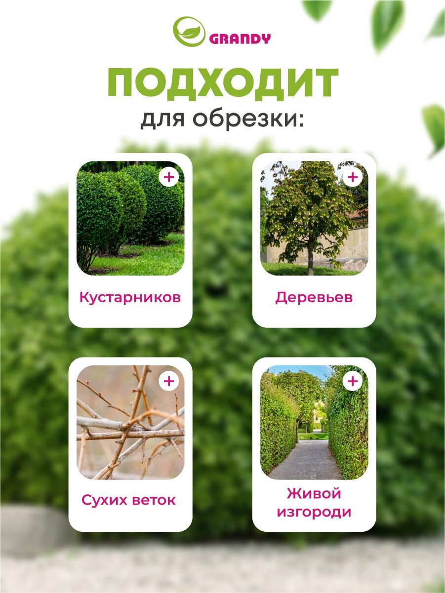 Да, благодаря длинным телескопическим ручкам и прочному стальному лезвию, Grandy эффективно справляется с формовкой плотных и высоких кустов, облегчая работу даже на большой высоте.