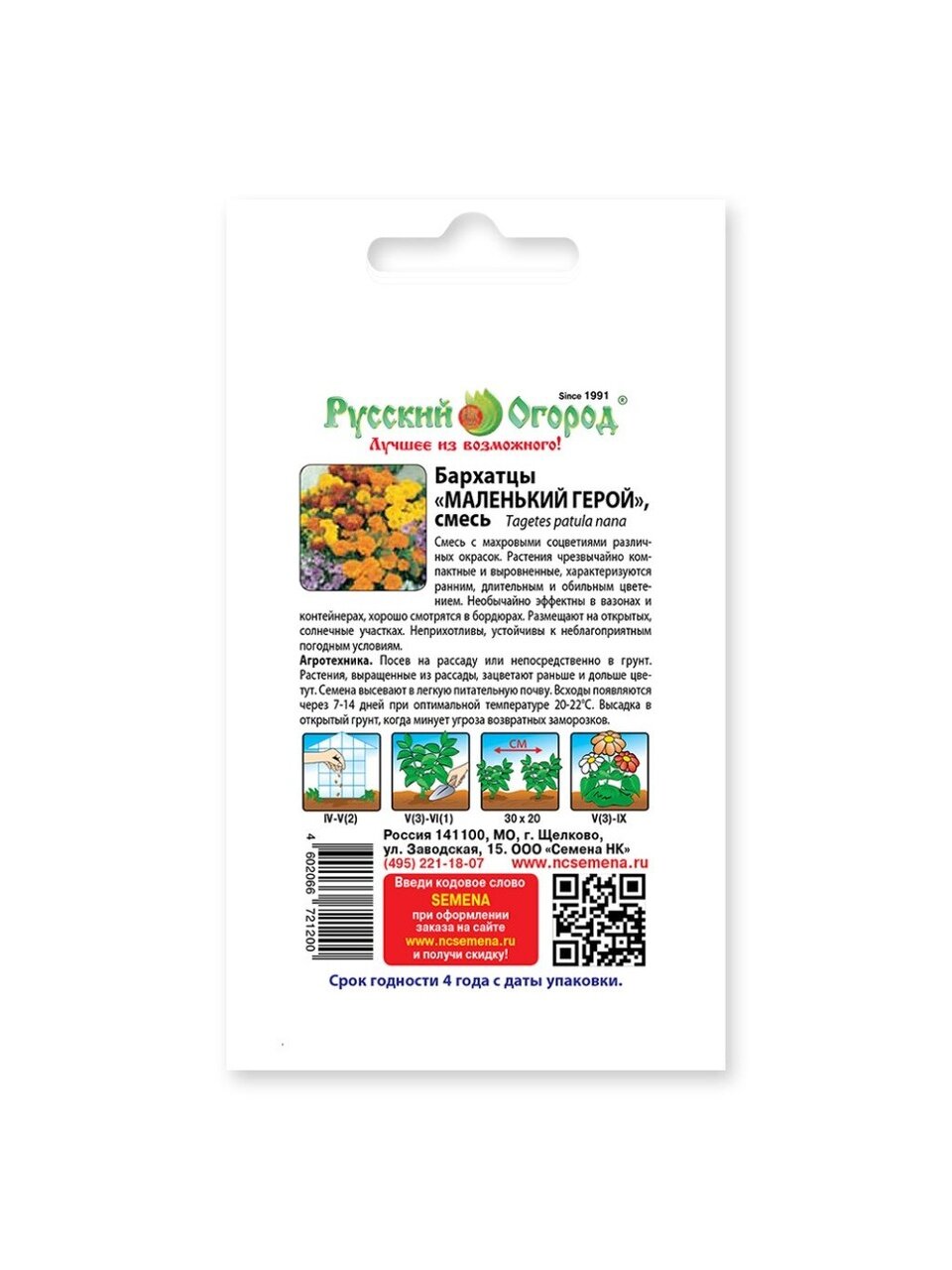 Вы можете приобрести «Семена Цветы, Бархатцы, Маленький герой, 0.2 г, цветная упаковка, Русский огород» и другие товары в нашем интернет-магазине в Смоленске по низким ценам и с бесплатным самовывозом.