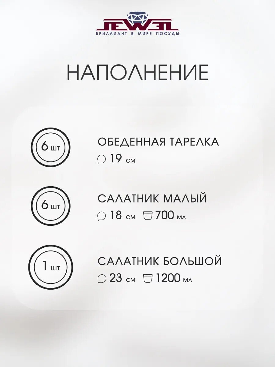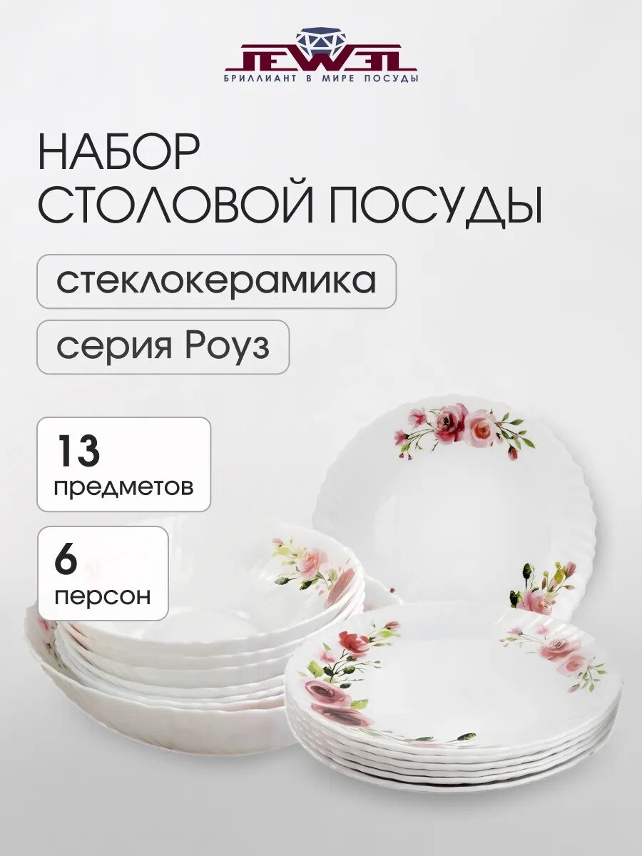 Столовый сервиз из стеклокерамики Jewel Роуз на 6 персон — 13 предметов для стильной сервировки и ежедневного комфорта. Безопасно для СВЧ и посудомоечной машины.