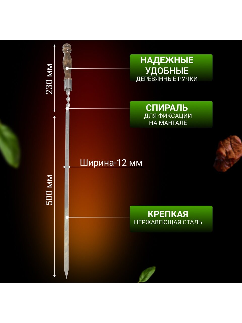 Шампур плоский 730 мм из нержавеющей стали с лакированной деревянной рукояткой — долговечный выбор для идеального шашлыка на даче, пикнике или в подарок.
