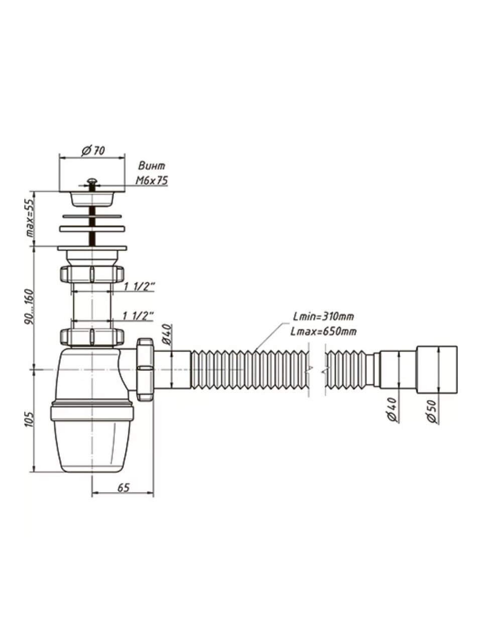 Бутылочный сифон выглядит как бутылка с горизонтальным ответвлением. Для подключения этой конструкции необходимо немного свободного пространства. Вода, которая находится в колбе, предупреждает проникновение канализационных запахов в помещение.