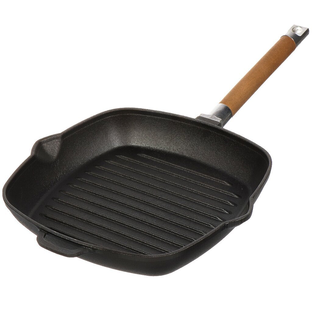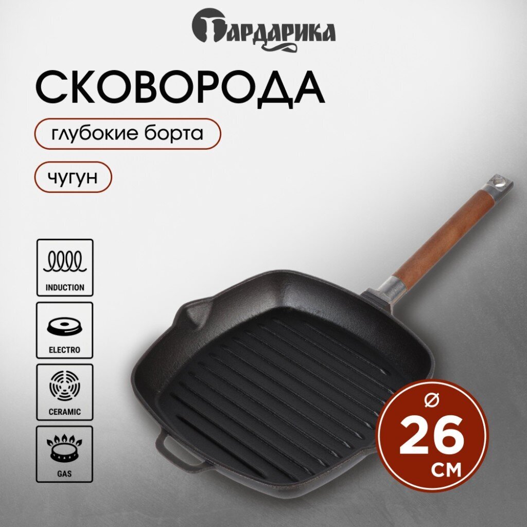 Сковорода-гриль чугунная 26 см Гардарика — идеальный выбор для мяса, рыбы и курицы: съемная деревянная ручка, подходит для индукции, глубокая и долговечная.