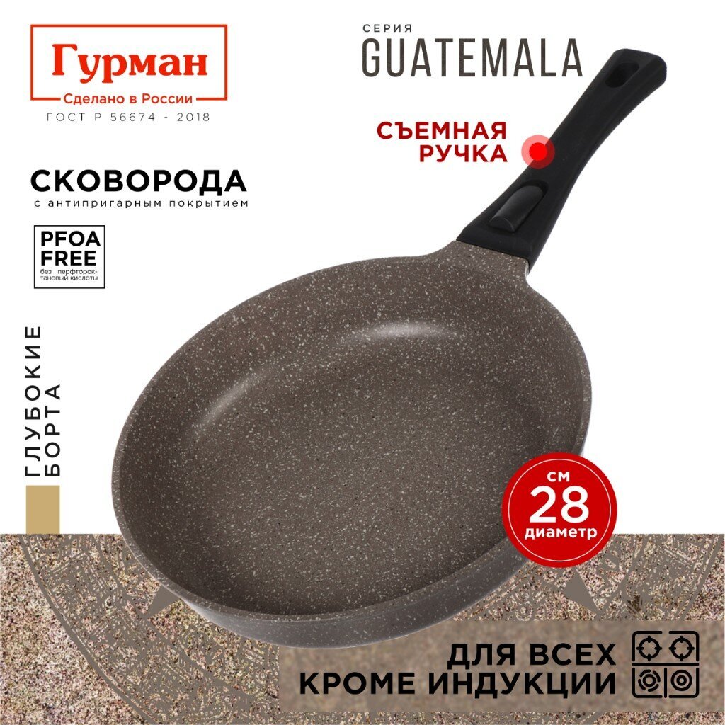 Сковорода из литого алюминия 28 см Гурман Guatemala: антипригарное мраморное покрытие, съемная ручка, универсальность для кухни и дачи — легко готовить любимые блюда каждый день.