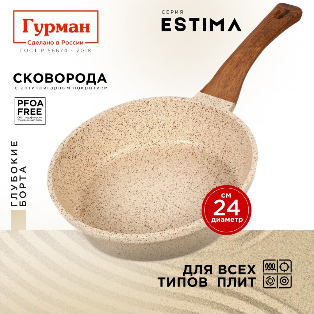 Вы можете приобрести «Сковорода литой алюминий, 24 см, антипригарное покрытие, Гурман, Estima, бежевая, индукция, ГМ2401 ЭБИ» и другие товары в нашем интернет-магазине в Казани по низким ценам и с бесплатным самовывозом.