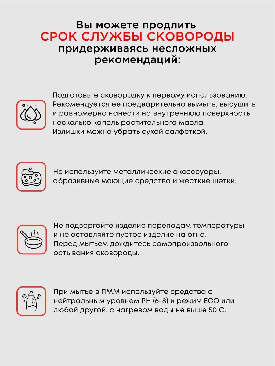 Можно мыть в посудомоечной машине или вручную, не использовать абразивные губки. Покрытие устойчиво к царапинам и не требует дополнительной обработки маслом.