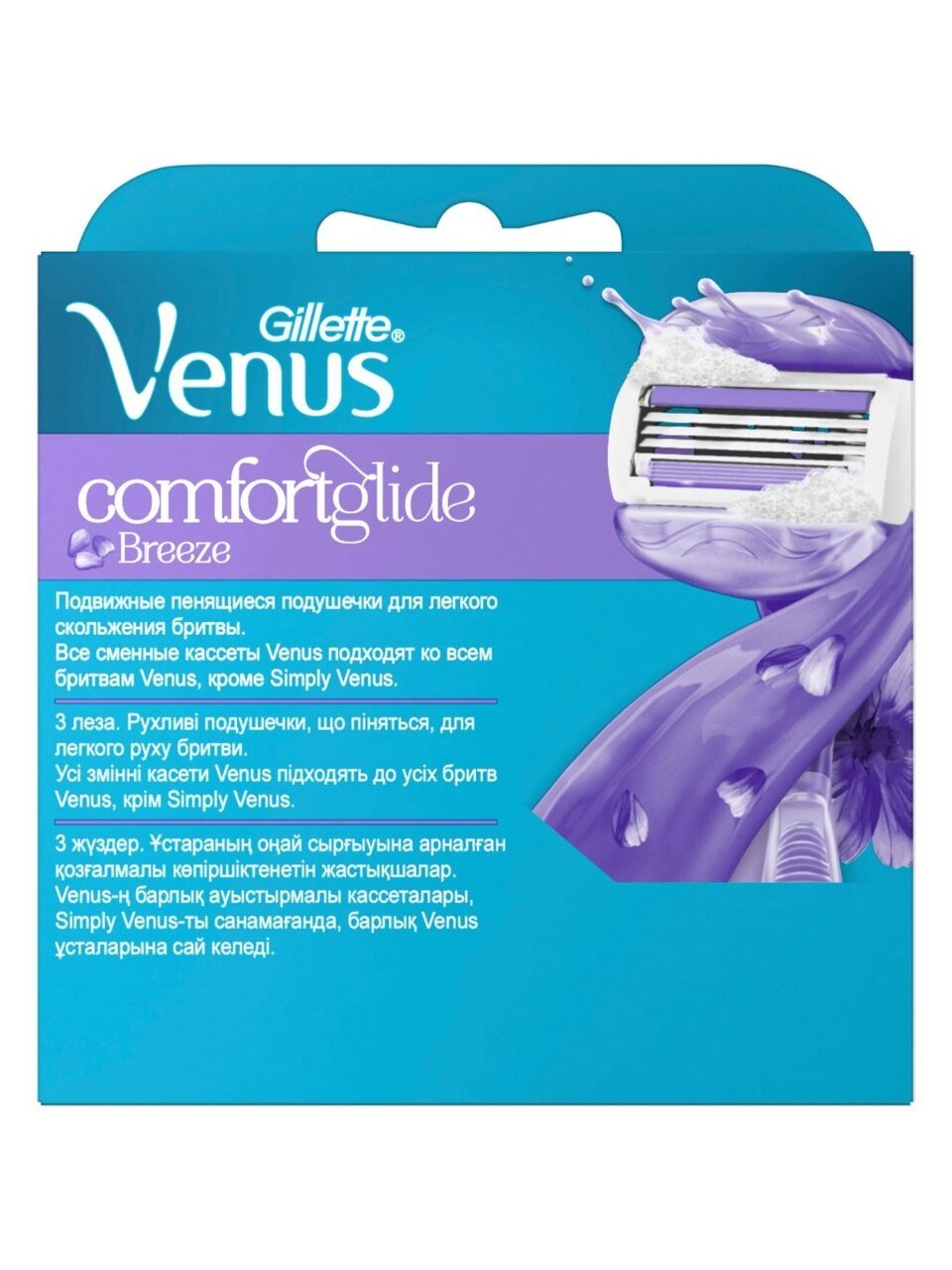 Сменные кассеты для бритвы Gillette Venus Breeze. Благодаря трем повторяющим изгибы тела лезвиям и разглаживающим кожу защитным подушечкам вокруг лезвий бритва обеспечивает гладкое и чистое бритье одним движением. Сменные кассеты с гелевыми подушечками смазывают кожу роскошными маслами фрезии, обеспечивая комфортное скольжение во время бритья.