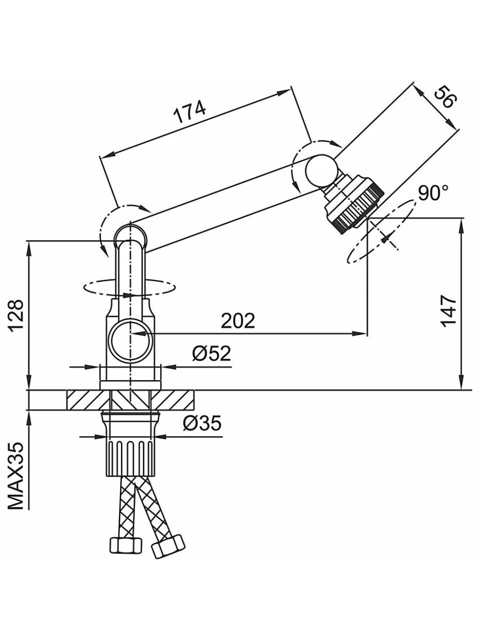 Смеситель устанавливается горизонтально через одно монтажное отверстие диаметром 52 мм, крепление — гайка, стандарт подводки 1/2".
