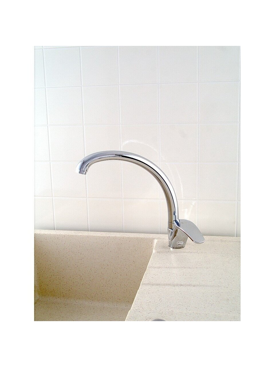 - Высокий излив 24,5 см и поворотная конструкция — удобно мыть посуду и наполнять крупную посуду
