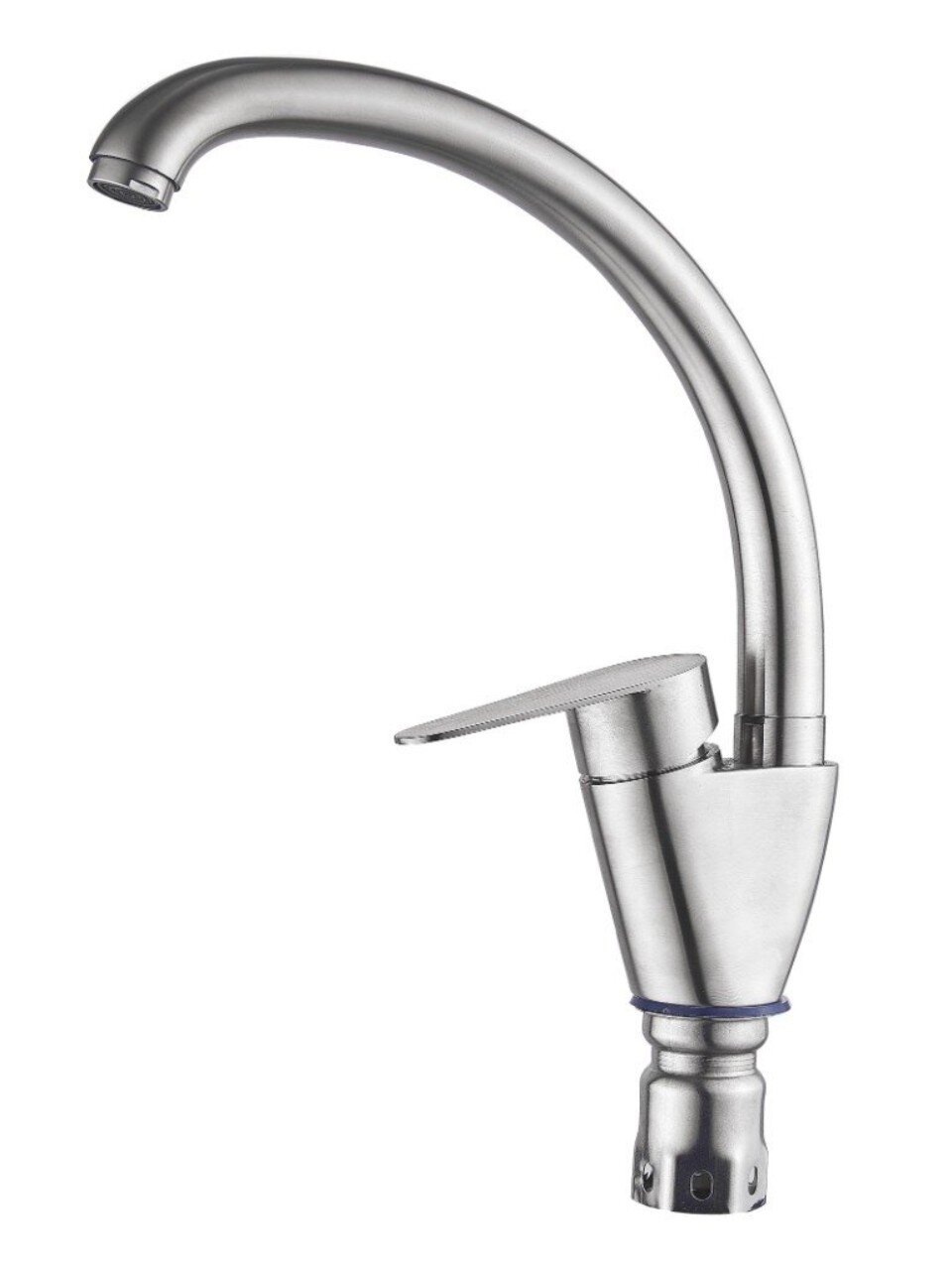 Смеситель для кухни Potato P59310SN — надежное решение из нержавеющей стали с высоким поворотным изливом и керамическим картриджем для долговечной работы.