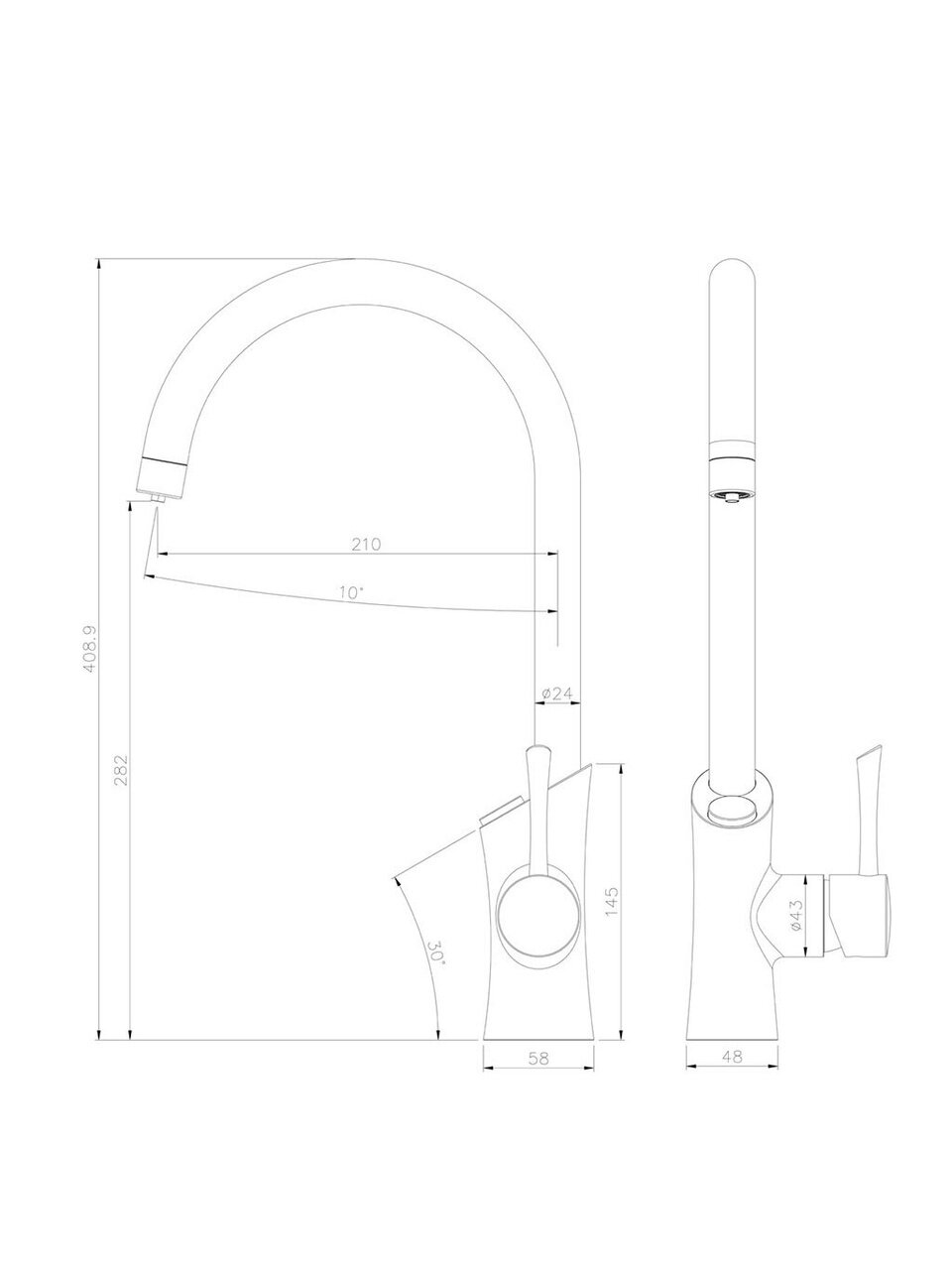 Высота излива — 28,2 см, длина — 21 см. Корпус изготовлен из латуни с хромированным покрытием, что обеспечивает прочность и долговечность.