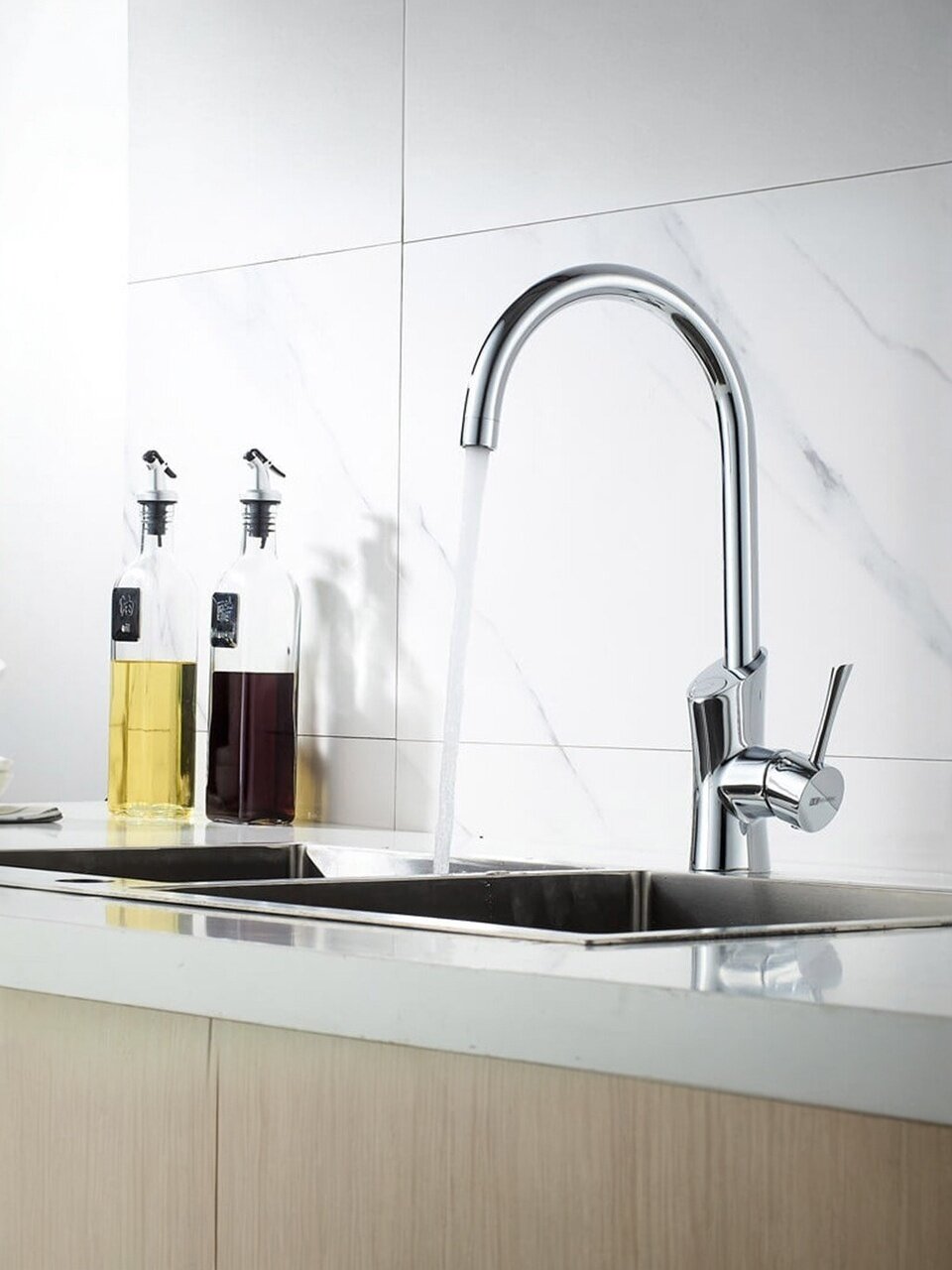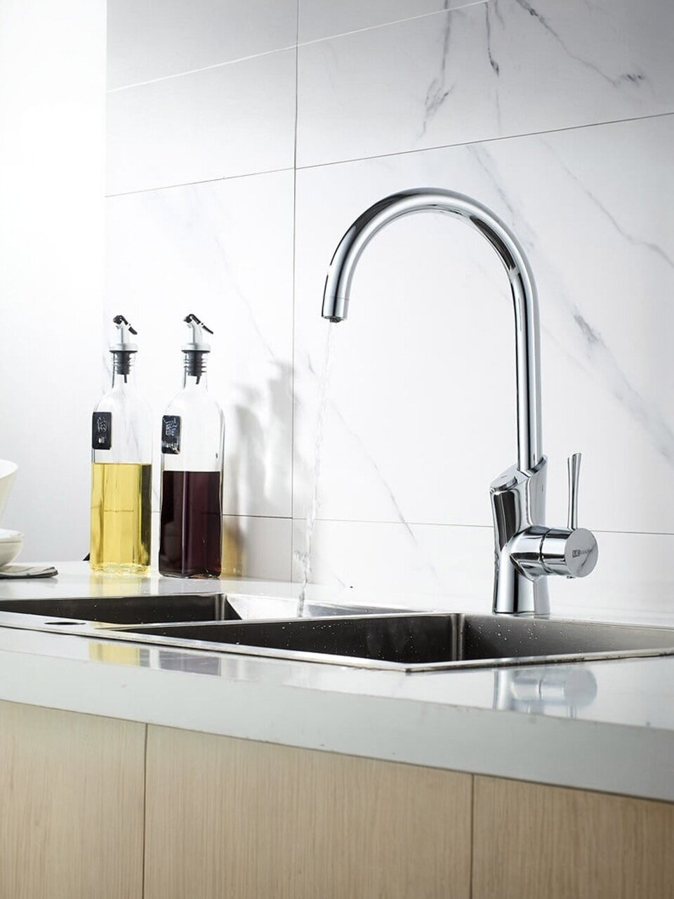Многие спрашивают: чем отличается этот смеситель от других моделей? Главное преимущество — встроенный переключатель подачи фильтрованной воды, что избавляет от необходимости устанавливать отдельный кран для питьевой воды. Это решение экономит место на мойке и делает кухню более эргономичной. Монтаж осуществляется в одно отверстие диаметром 48 мм, подходит для большинства современных моек. Глянцевая хромированная поверхность легко очищается, не тускнеет со временем.