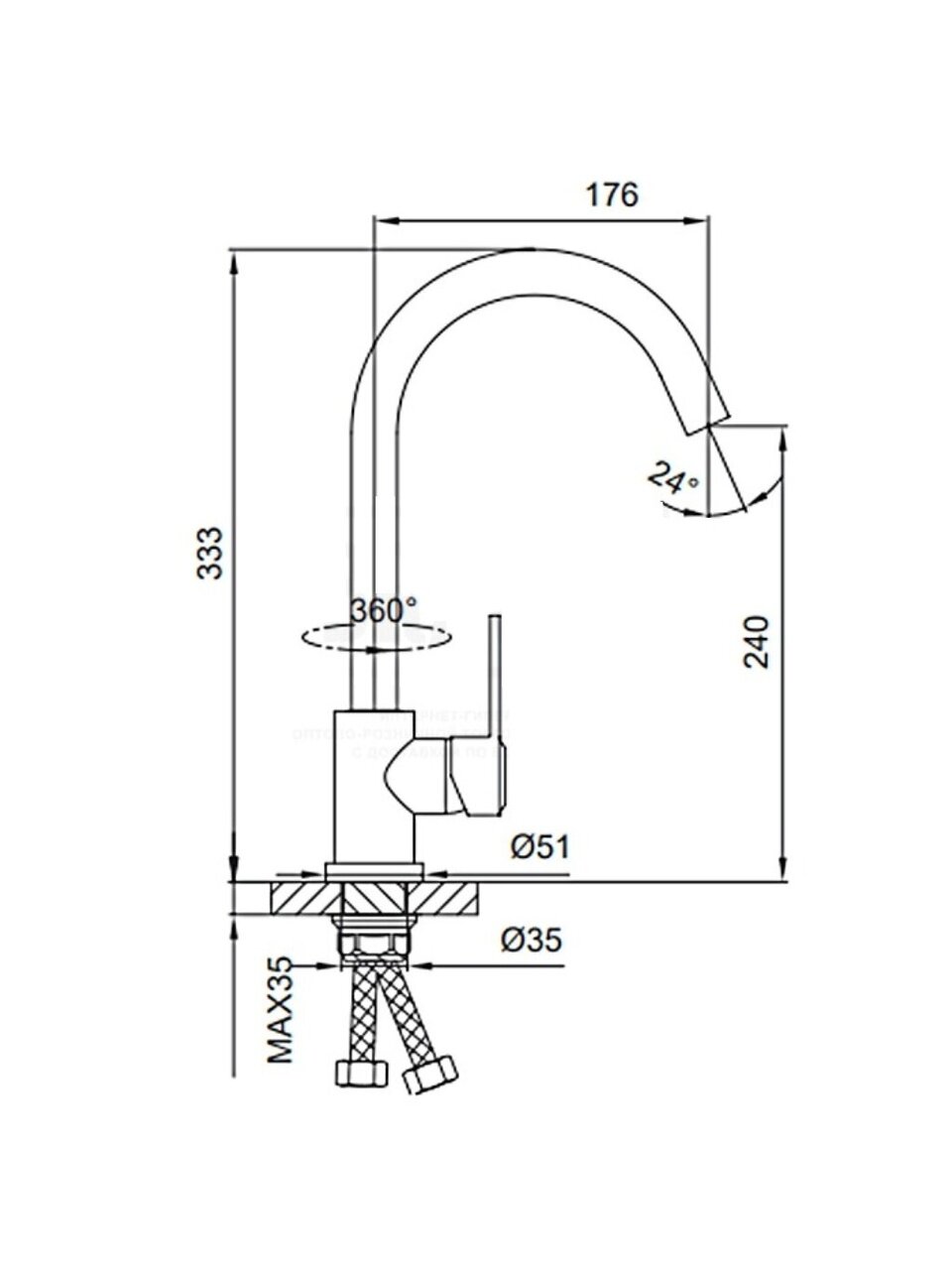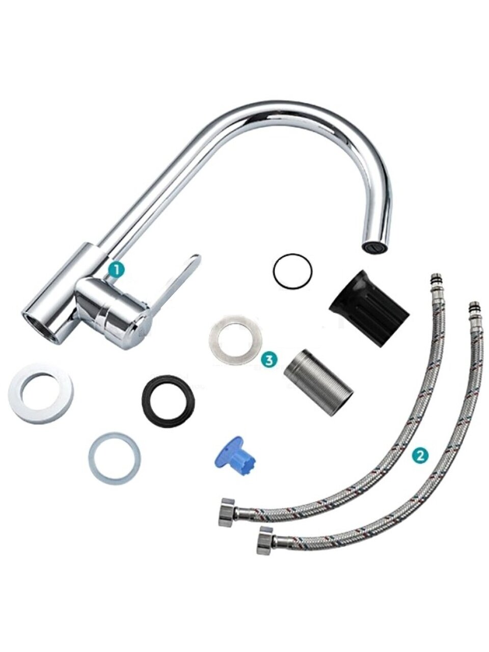 Высота излива — 24 см, длина — 17,6 см. Форма круглая, излив поворотный, что удобно для мойки больших предметов и экономии пространства.
