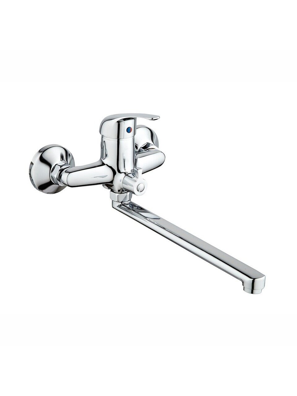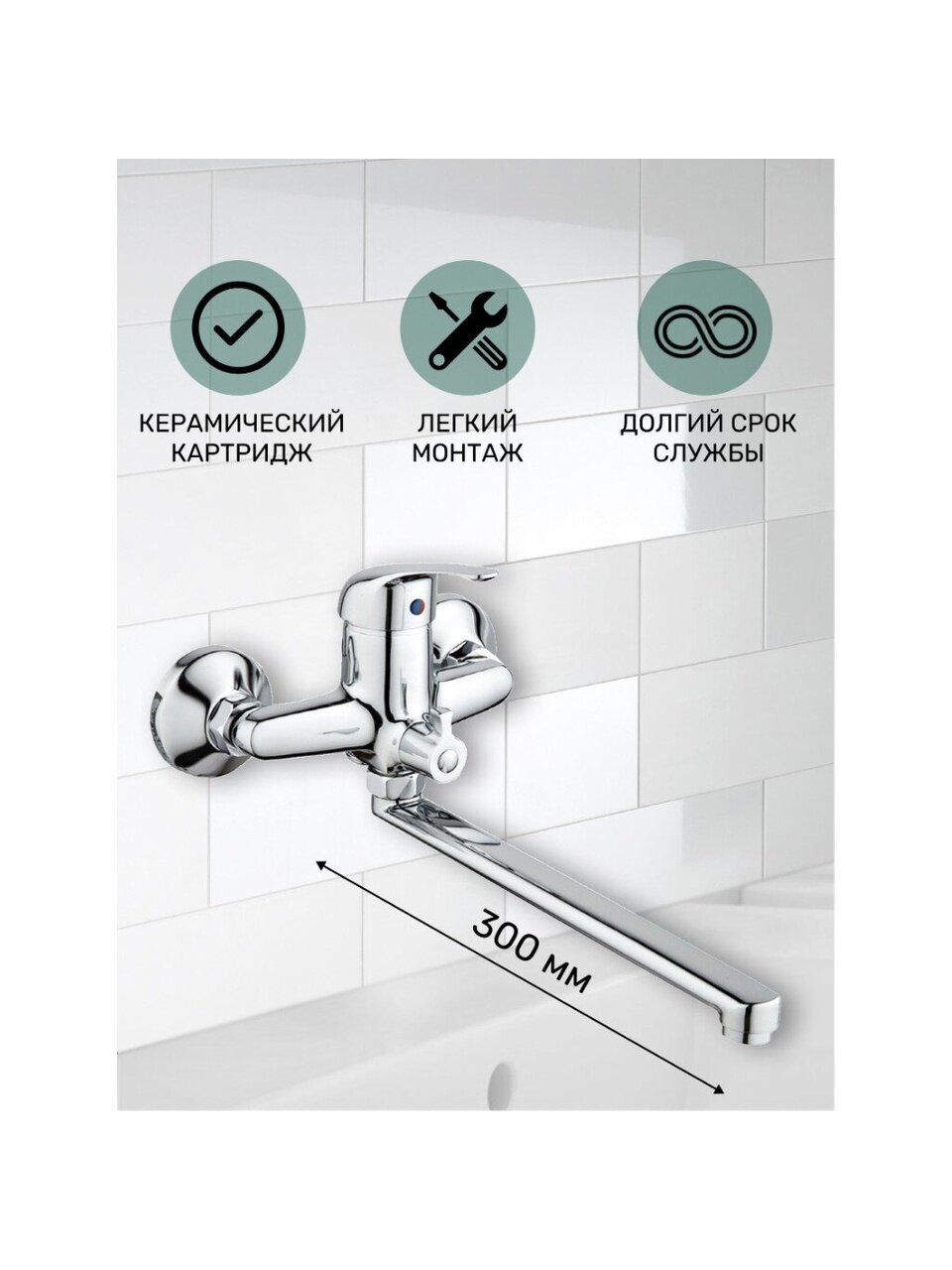 У данной модели длинный поворотный излив (30 см), что удобно для наполнения ванны и мытья, а также рычажное управление для быстрой регулировки температуры и напора воды.