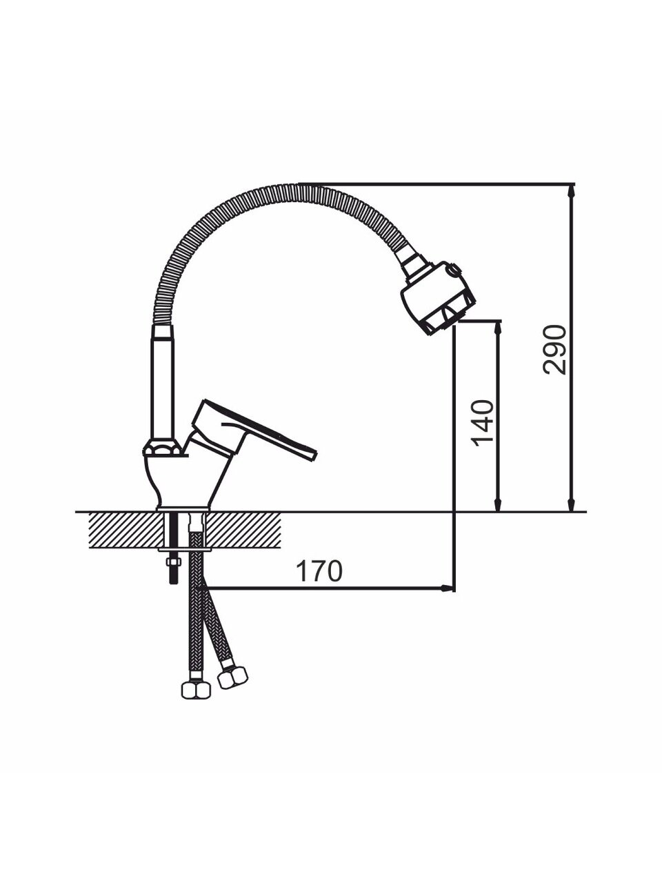 Высота излива — 14 см, длина — 17 см. Гибкий излив обеспечивает удобство даже на компактных мойках, подходит для стандартных и маленьких кухонь.