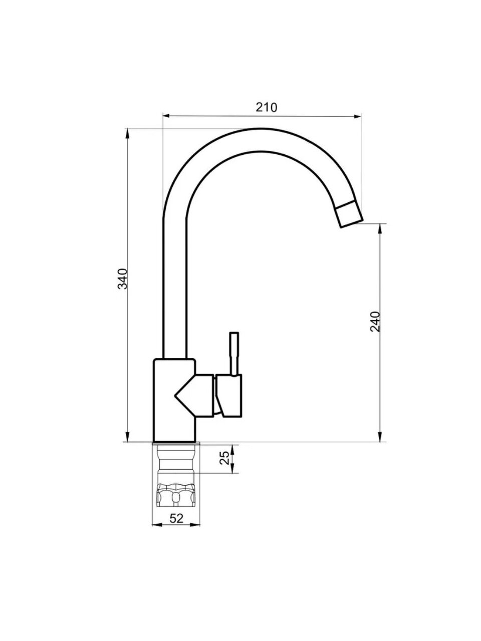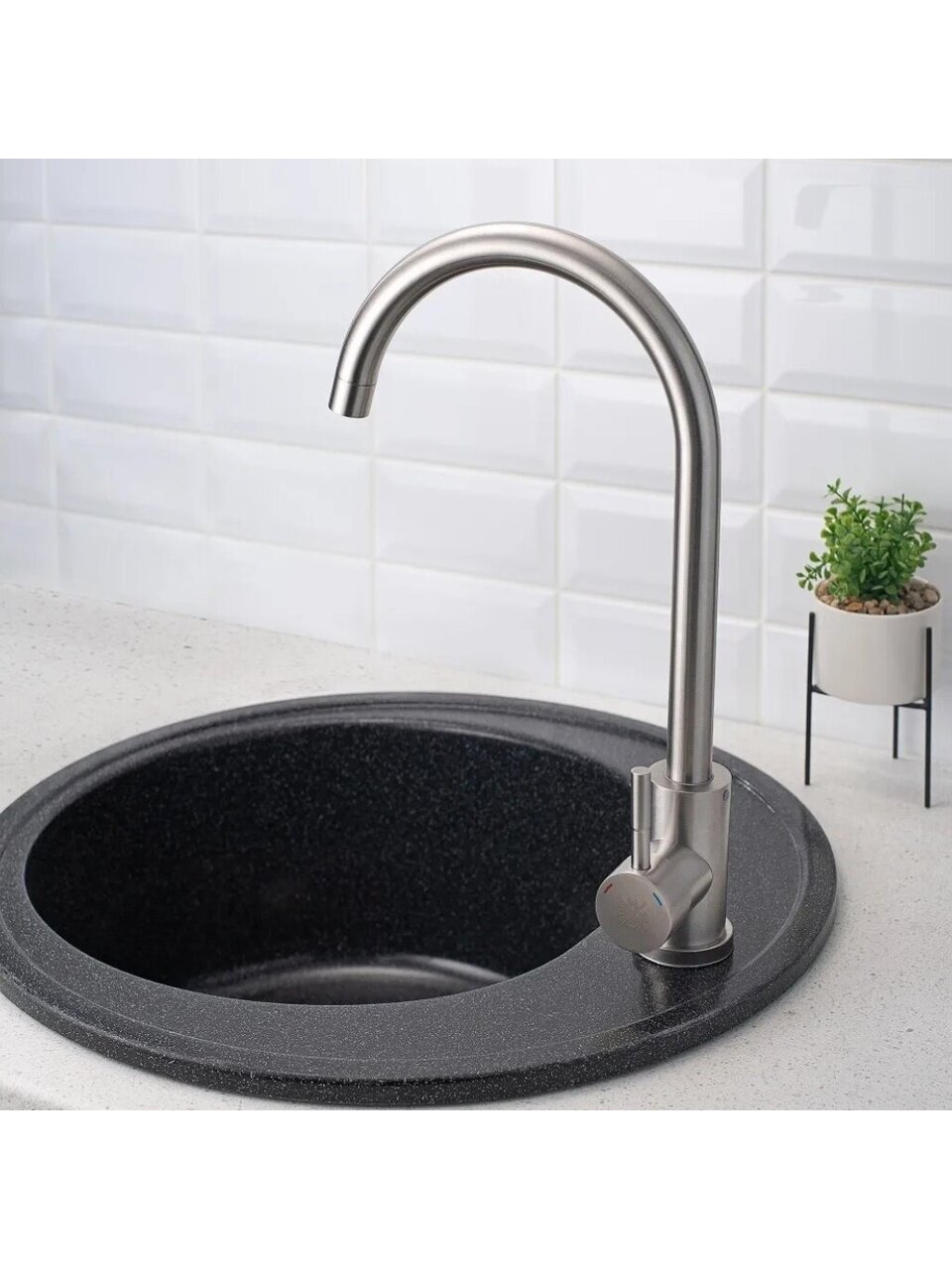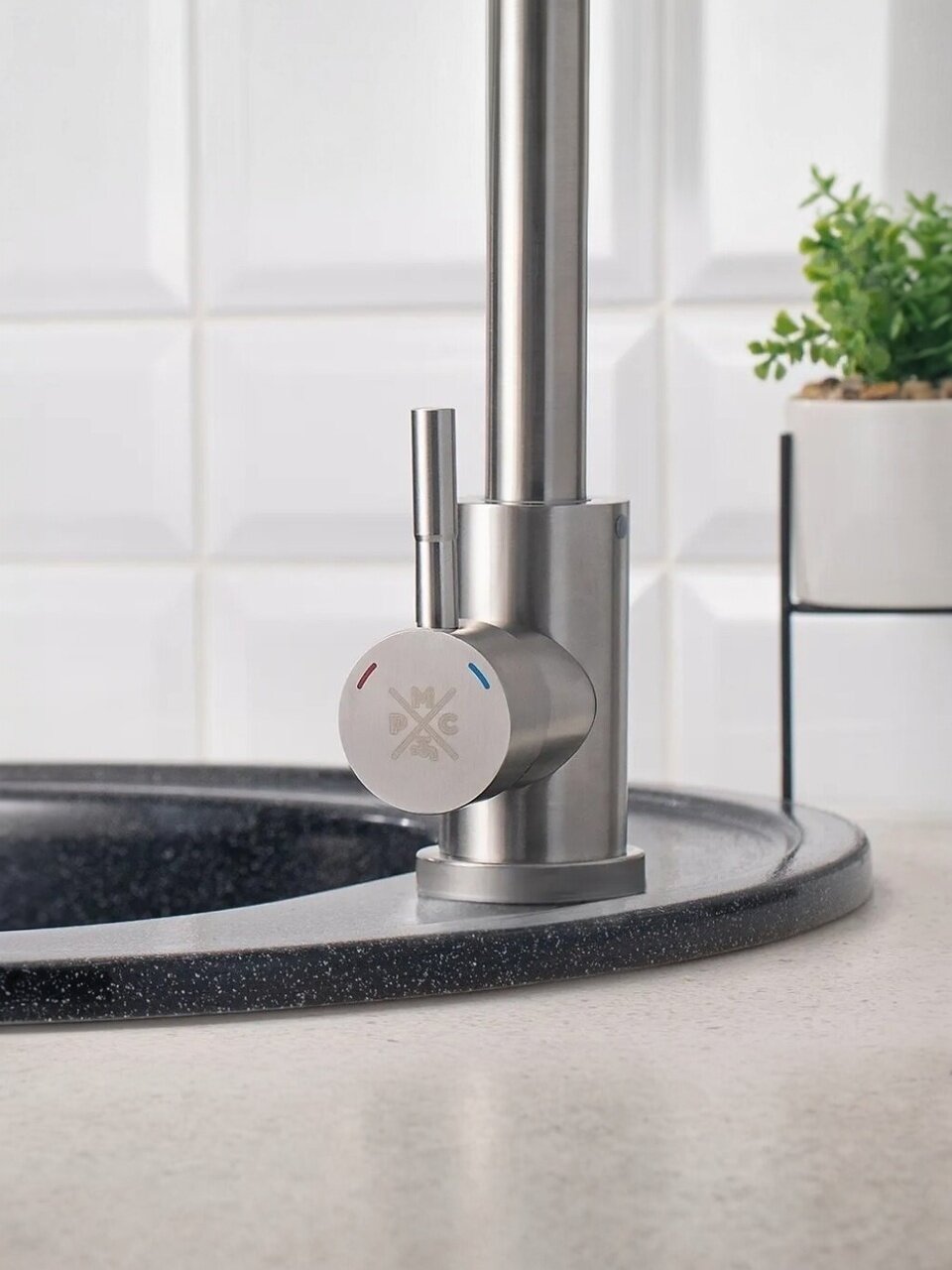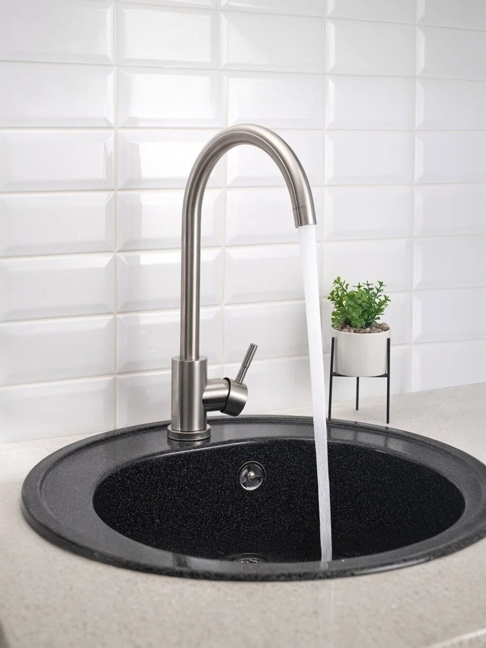- Высокий поворотный излив 24 см и однорычажное управление — удобно мыть крупную посуду, экономить воду