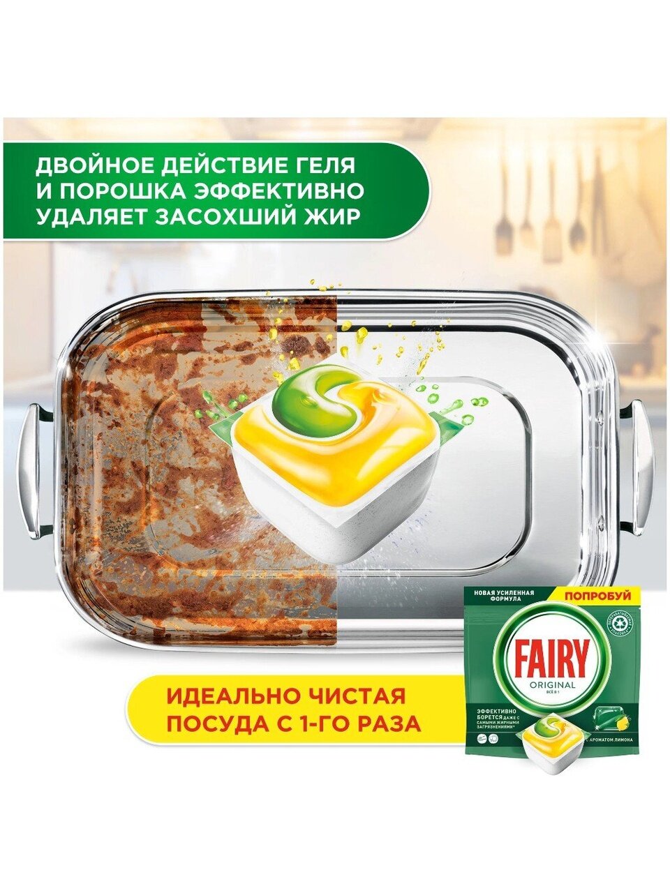 Капсулы Fairy с ароматом лимона удаляют сложные загрязнения с посуды с первого раза, придавая ей эффект сияния и приятный цитрусовый аромат. Многокамерные капсулы содержат гель и порошок, благодаря чему с первого раза отмывают даже сложные загрязнения с любой посуды и придают ей суперблеск.