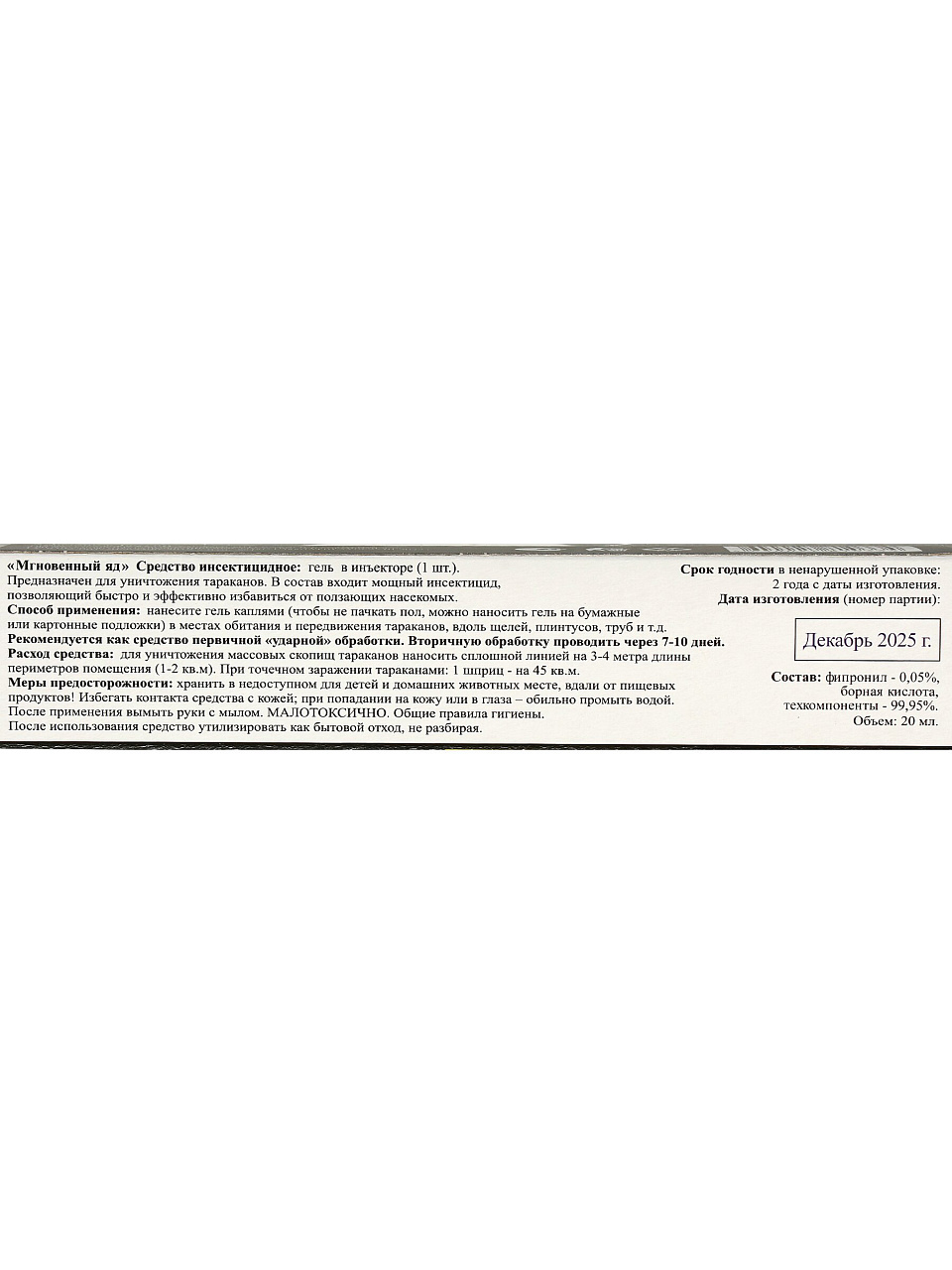 В отличие от порошков и аэрозолей, борный гель действует точечно и не требует проветривания помещения после применения. Если вы спрашиваете, как использовать инсектицид для максимального эффекта — просто нанесите небольшие полоски в местах скопления насекомых. Средство подходит для семей с детьми и домашними животными при соблюдении инструкции.