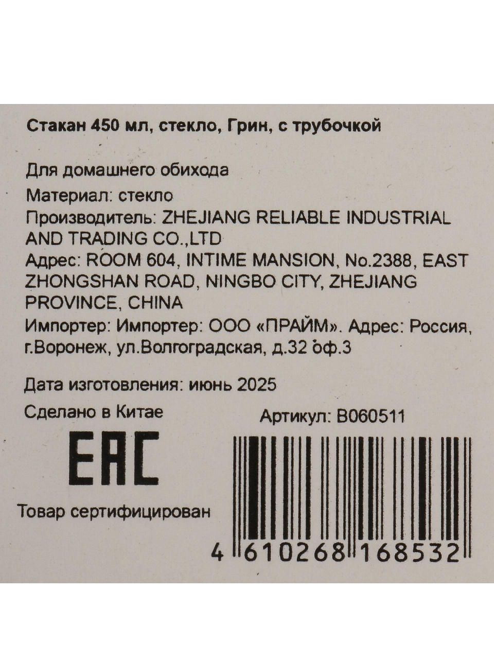Объём — 450 мл. В комплекте 1 стакан из стекла с трубочкой, оптимальный для ежедневного использования дома или на даче.