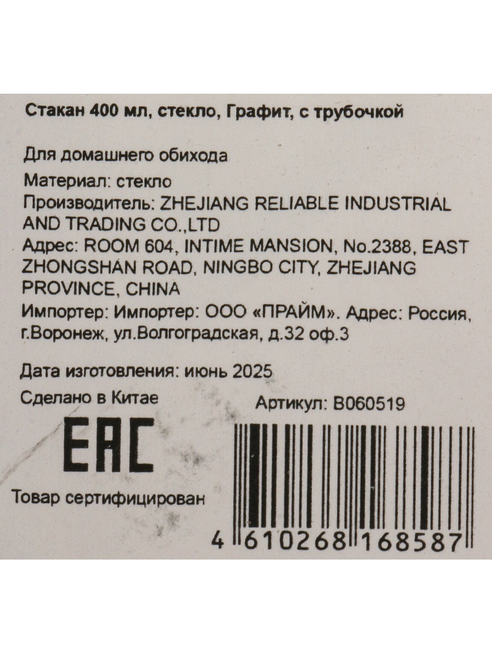 В набор входит 1 стакан объёмом 400 мл из графитового стекла с трубочкой — удобный вариант для индивидуального пользования или подарка.