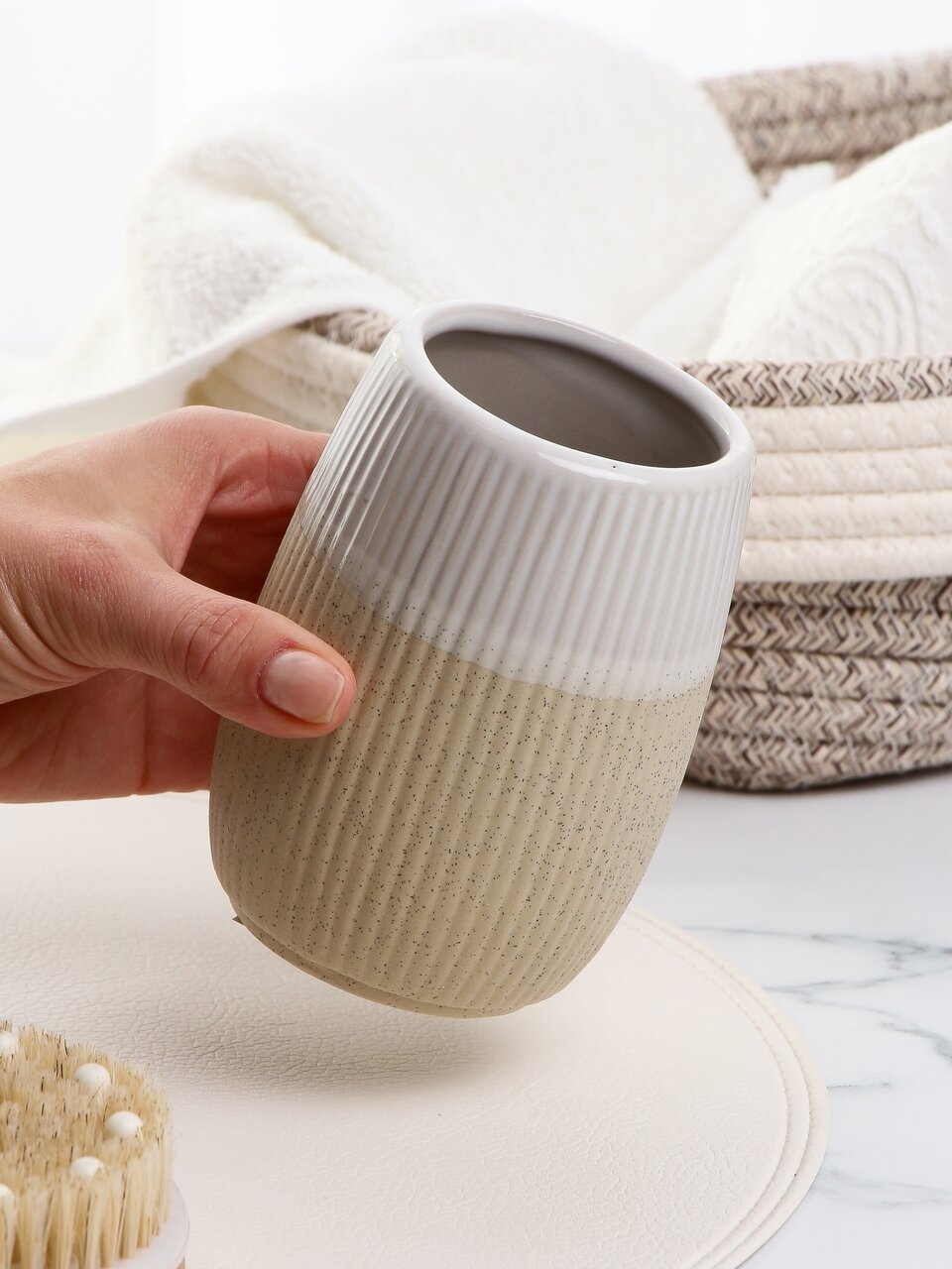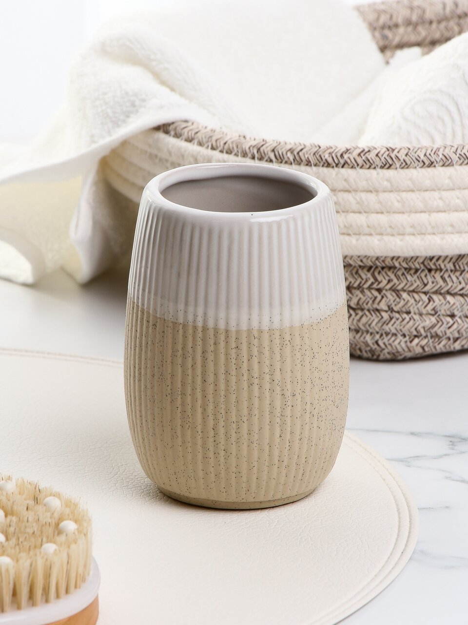 Стильный керамический стакан для зубных щеток «Бежевый камень» Y4-9879: современный дизайн, натуральная фактура, идеален для ванной и подарка.