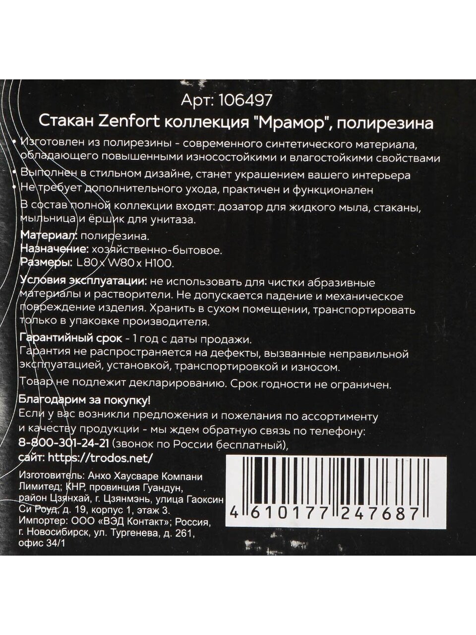 Как выбрать стакан для ванной? Ориентируйтесь на материал и размеры: Zenfort «Мрамор» оптимален для стандартных и компактных санузлов. Без держателя — легко переставлять и мыть. Подходит для подарка благодаря стильной упаковке и универсальному дизайну.