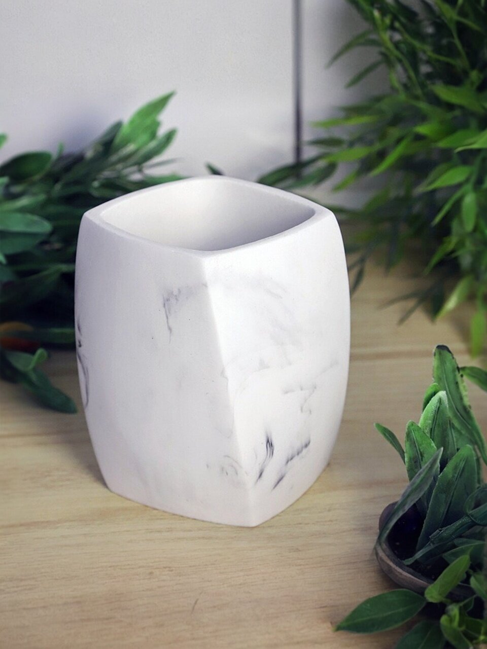 Стакан выполнен из прочной полирезины с матовой поверхностью и рисунком «под мрамор». Не скользит, устойчив к влаге, без держателя, квадратной формы.