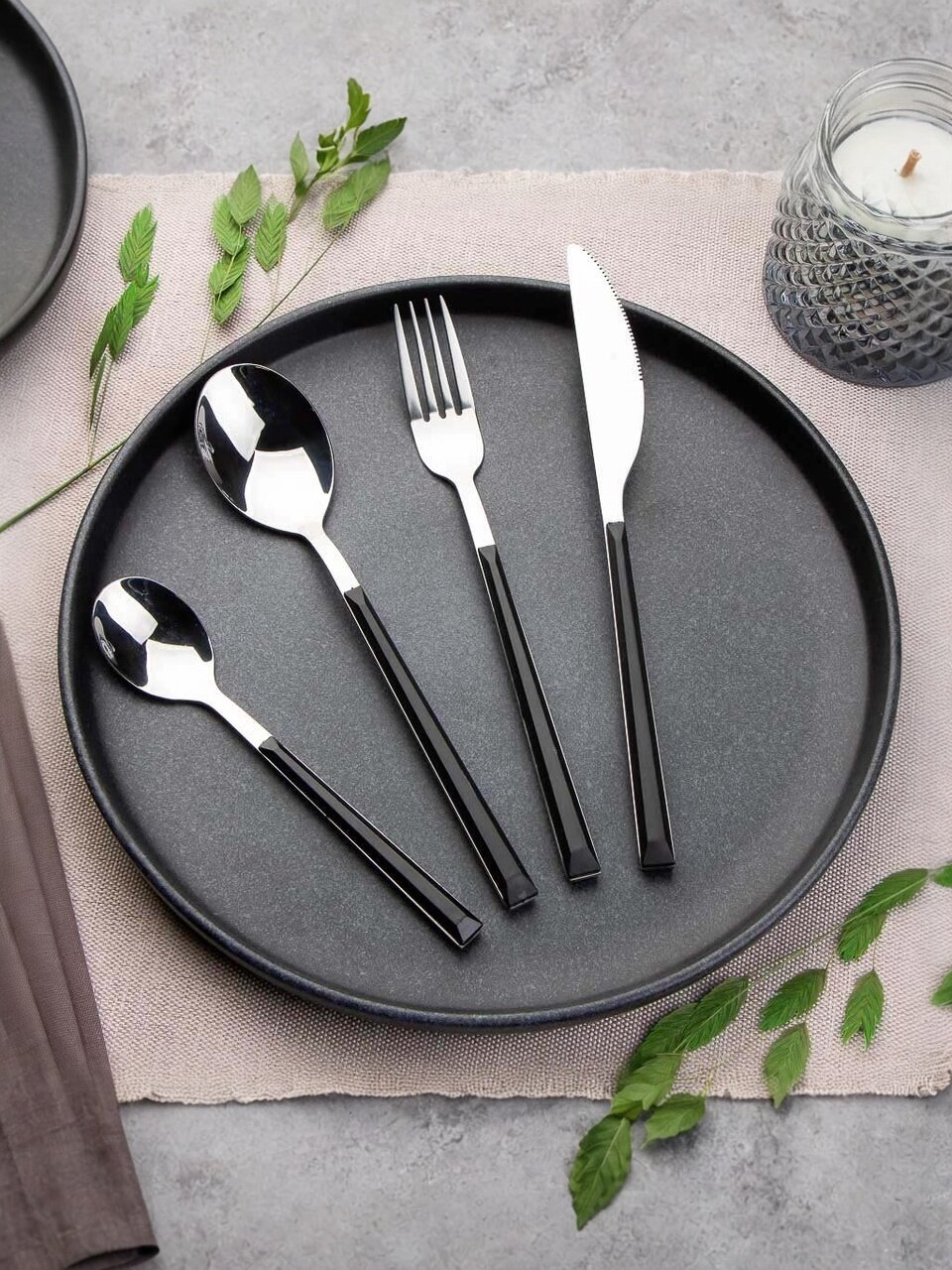 Стильный набор столовых приборов из пластика и металла на 6 персон: 24 предмета в черном глянце — практичное решение для дома, дачи и подарка.