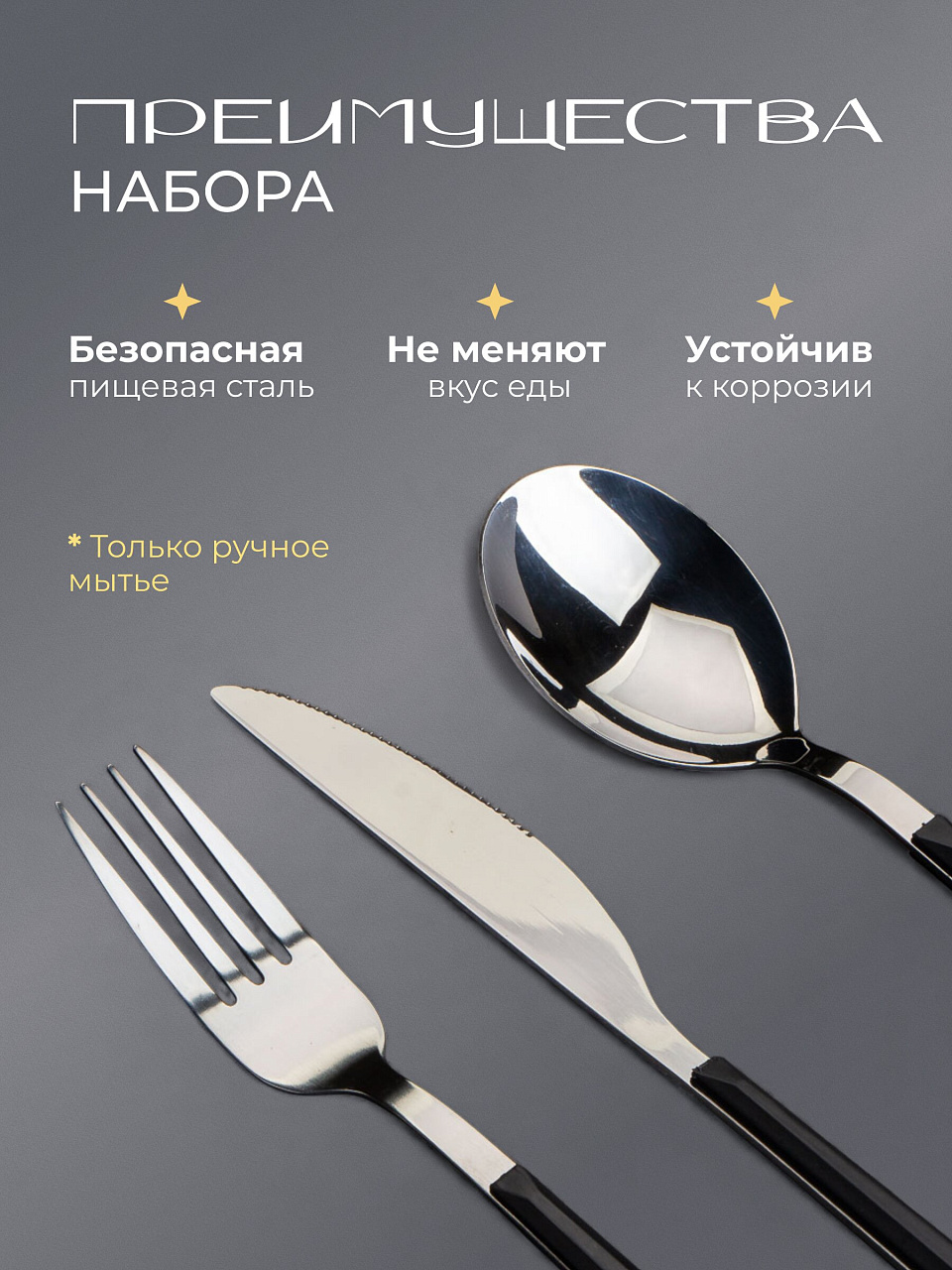 Многие покупатели спрашивают: «Чем отличается такой набор от полностью металлических аналогов?» — пластиковые ручки обеспечивают легкость и не нагреваются, что особенно удобно для детей и пожилых людей. Металлическая часть устойчива к коррозии, но не рекомендуется мыть приборы в посудомоечной машине, чтобы сохранить блеск и целостность покрытия. Если вы ищете, какой набор столовых приборов выбрать для подарка — обратите внимание на стильную упаковку и универсальный черный цвет, который подойдет к любому интерьеру.