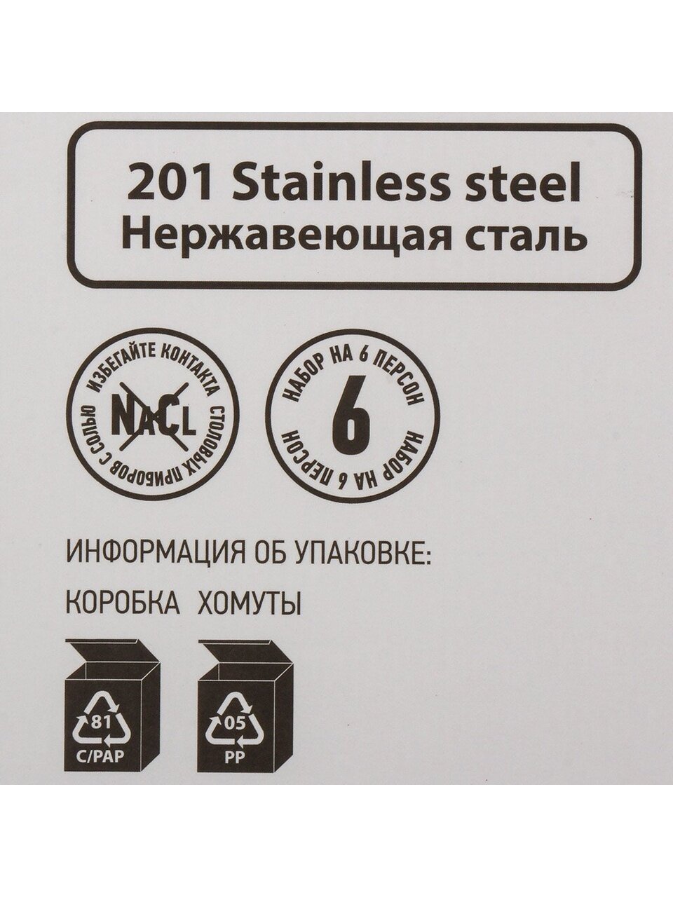 В комплекте 24 предмета на 6 персон: ложки, вилки, ножи и чайные ложки. Все приборы выполнены из нержавеющей стали без покрытия, с металлическими ручками.